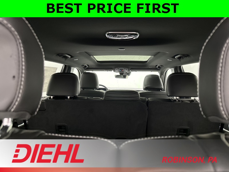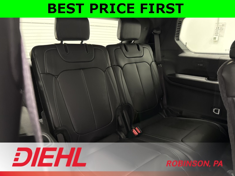 Inside, it’s smart, spacious, and genuinely comfortable for everyone on board. Three rows of seating give you room for passengers, kids, car seats, or cargo without playing Tetris, and the second row slides to make third-row access easy. Up front you’ll find a large touchscreen with built-in navigation, Apple CarPlay, Android Auto, multiple USB ports, and a Wi-Fi hotspot to keep everyone connected. Heated front and second-row seats, a heated steering wheel, power adjustable seats with memory, and tri-zone climate control mean nobody’s arguing about temperature ever again… or at least not as often.