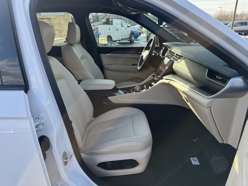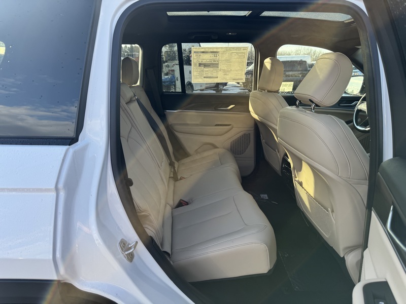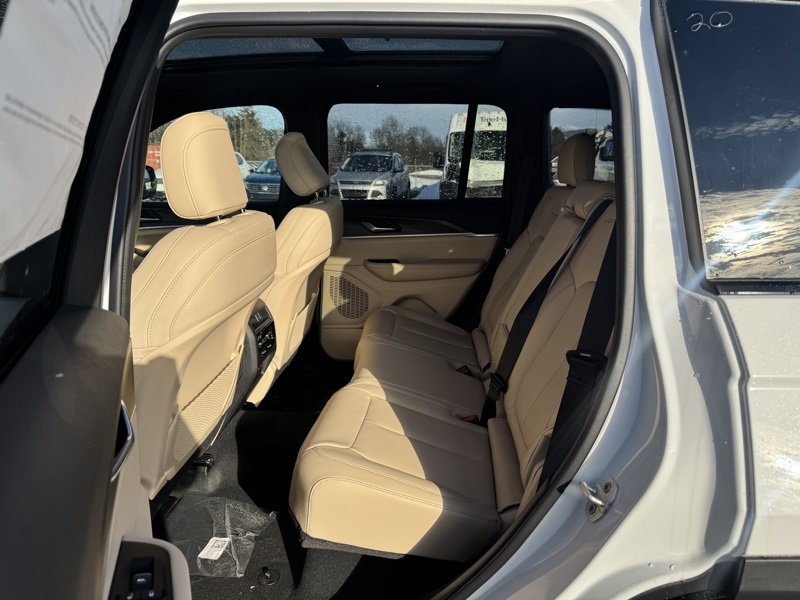 Black Appearance Package (Gloss Black Exterior Accents and Wheels: 20" x 8.5" Gloss Black Painted Aluminum), Quick Order Package 22E, 4WD, 4-Wheel Disc Brakes, 6 Speakers, ABS brakes, Active Noise Control System, Air Conditioning, Alloy wheels, AM/FM radio: SiriusXM with 360L, Anti-whiplash front head restraints, Audio memory, Auto High-beam Headlights, Automatic temperature control, Brake assist, Bumpers: body-color, Capri Leatherette Seats, Compass, Delay-off headlights, Driver door bin, Driver vanity mirror, Dual front impact airbags, Dual front side impact airbags, Dual-Pane Panoramic Sunroof, Electronic Stability Control, Emergency communication system, Four wheel independent suspension, Front anti-roll bar, Front Bucket Seats, Front Center Armrest w/Storage, Front dual zone A/C, Front fog lights, Front reading lights, Fully automatic headlights, Garage door transmitter, Heated door mirrors, Heated front seats, Heated rear seats, Heated steering wheel, Illuminated entry, Knee airbag, Low tire pressure warning, Memory seat, Model Year Tracking, Navigation System, Normal Duty Suspension, Occupant sensing airbag, Outside temperature display, Overhead airbag, Overhead console, Panic alarm, ParkView Rear Back-Up Camera, Passenger door bin, Passenger vanity mirror, Power door mirrors, Power driver seat, Power Liftgate, Power passenger seat, Power steering, Power windows, Radio data system, Rear anti-roll bar, Rear reading lights, Rear window defroster, Rear window wiper, Remote keyless entry, Security system, Speed control, Speed-Sensitive Wipers, Split folding rear seat, Spoiler, Steering wheel mounted audio controls, Tachometer, Telescoping steering wheel, Tilt steering wheel, Traction control, Trip computer, Turn signal indicator mirrors, Variably intermittent wipers, Voltmeter, and Wheels: 18" x 8" Polished/Painted Aluminum. 4WD. Bright White Clearcoat 2025 Jeep Grand Cherokee Limited 4WD 8-Speed Automatic 3.6L V6 24V VVT