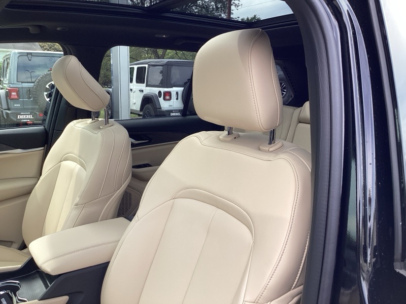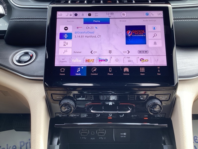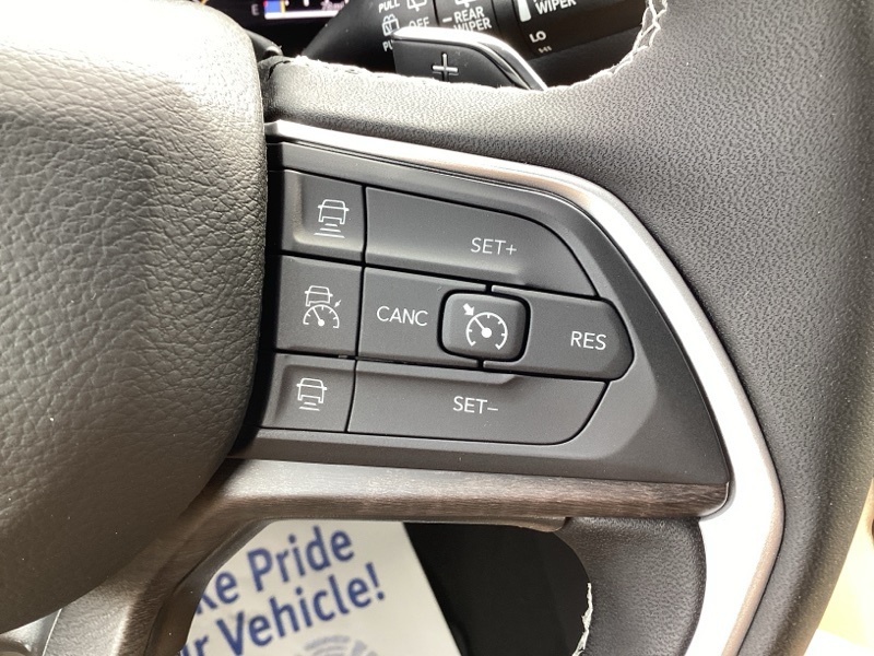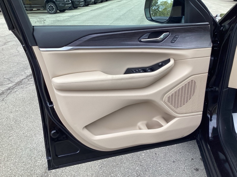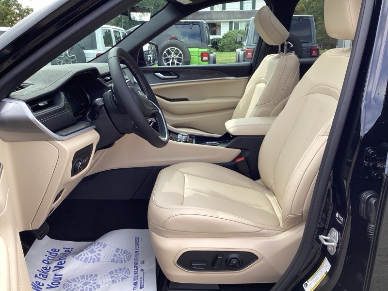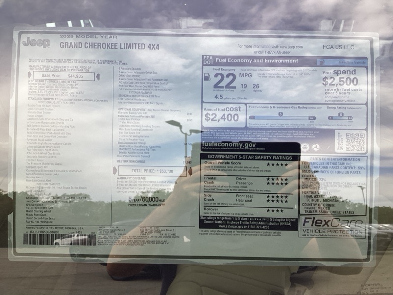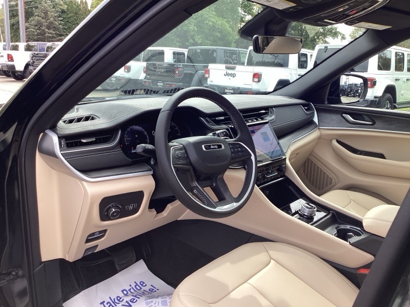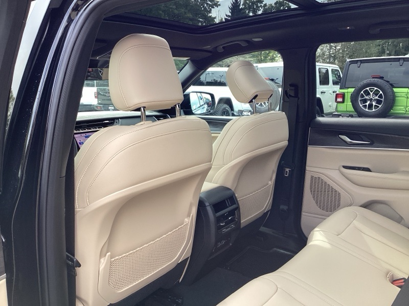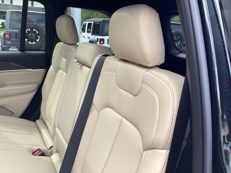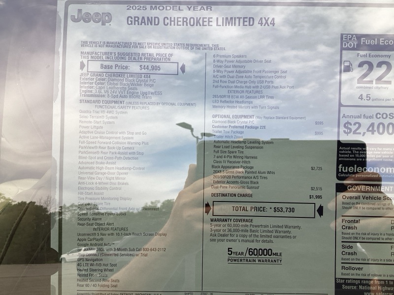 Black Appearance Package (Gloss Black Exterior Accents and Wheels: 20" x 8.5" Gloss Black Painted Aluminum), Quick Order Package 22E, Trailer Tow Package (220 Amp Alternator, 7 and 4-Pin Wiring Harness, Automatic Headlamp Levelling System, Class IV Receiver Hitch, Heavy-Duty Engine Cooling, Rear Load Levelling Suspension, and Trailer Hitch Zoom), 4WD, 4-Wheel Disc Brakes, 6 Speakers, ABS brakes, Active Noise Control System, Air Conditioning, Alloy wheels, AM/FM radio: SiriusXM with 360L, Anti-whiplash front head restraints, Audio memory, Auto High-beam Headlights, Automatic temperature control, Brake assist, Bumpers: body-color, Capri Leatherette Seats, Compass, Delay-off headlights, Driver door bin, Driver vanity mirror, Dual front impact airbags, Dual front side impact airbags, Dual-Pane Panoramic Sunroof, Electronic Stability Control, Emergency communication system, Four wheel independent suspension, Front anti-roll bar, Front Bucket Seats, Front Center Armrest w/Storage, Front dual zone A/C, Front fog lights, Front reading lights, Fully automatic headlights, Garage door transmitter, Heated door mirrors, Heated front seats, Heated rear seats, Heated steering wheel, Illuminated entry, Knee airbag, Low tire pressure warning, Memory seat, Model Year Tracking, Navigation System, Normal Duty Suspension, Occupant sensing airbag, Outside temperature display, Overhead airbag, Overhead console, Panic alarm, ParkView Rear Back-Up Camera, Passenger door bin, Passenger vanity mirror, Power door mirrors, Power driver seat, Power Liftgate, Power passenger seat, Power steering, Power windows, Radio data system, Radio: Uconnect 5 Nav with 10.1" Display, Rear anti-roll bar, Rear reading lights, Rear window defroster, Rear window wiper, Remote keyless entry, Security system, Speed control, Speed-Sensitive Wipers, Split folding rear seat, Spoiler, Steering wheel mounted audio controls, Tachometer, Telescoping steering wheel, Tilt steering wheel, Traction control, Trip computer, Turn signal indicator mirrors, Variably intermittent wipers, Voltmeter, and Wheels: 18" x 8" Polished/Painted Aluminum. 4WD. Diamond Black Crystal Pearlcoat 2025 Jeep Grand Cherokee Limited 4WD 8-Speed Automatic 3.6L V6 24V VVT