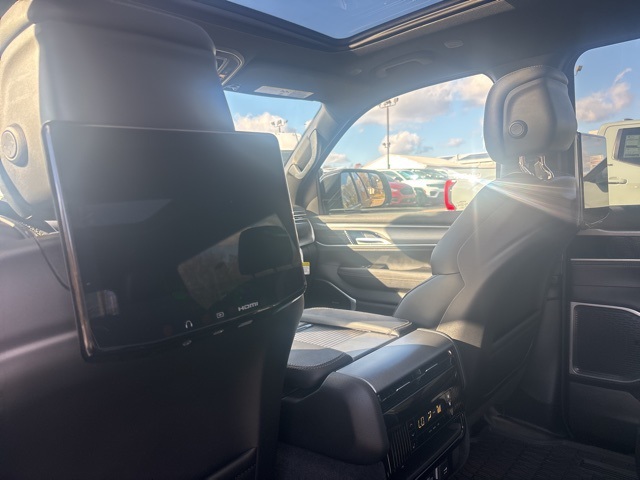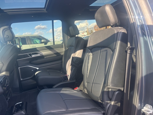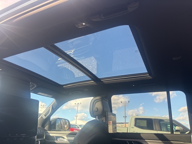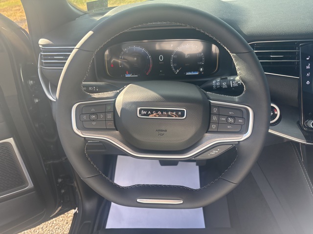 Carbide Appearance Package, MOPAR Interior Protection Package (All-Season Floor Mats and Cargo Tray), Premium Group I (3 Panel Sunroof, Adjustable Roof Rail Crossbars, Cargo Cover, and Reversible Carpet/Vinyl Cargo Mat), Quick Order Package 25F Carbide (Black Exterior Accents and Wheels: 20" x 9" Gloss Black Painted Aluminum), Rear Seat Video Group 1 (Amazon Fire TV Built-In, Seatback Video Screens, and Video USB Port), 10 Speakers, 118 MPH Maximum Speed Calibration, 3.55 Rear Axle Ratio, 3rd row seats: bench, 4-Wheel Disc Brakes, ABS brakes, Air Conditioning, Alloy wheels, AM/FM radio: SiriusXM with 360L, Anti-whiplash front head restraints, Apple CarPlay/Android Auto, Audio memory, Auto Adjust In Reverse Exterior Mirrors, Auto-dimming door mirrors, Auto-Dimming Exterior Driver Mirror, Auto-dimming Rear-View mirror, Auto-leveling suspension, Automatic temperature control, Brake assist, Bumpers: body-color, Compass, Delay-off headlights, Driver door bin, Driver vanity mirror, Driver's Seat Mounted Armrest, Dual front impact airbags, Dual front side impact airbags, Electronic Stability Control, Emergency communication system: Jeep Connect, Exterior Mirrors Approach Lamps, Exterior Mirrors w/Memory, Exterior Mirrors w/Supplemental Signals, Four wheel independent suspension, Front anti-roll bar, Front Bucket Seats, Front Center Armrest w/Storage, Front dual zone A/C, Front fog lights, Front License Plate Bracket, Front reading lights, Fully automatic headlights, Garage door transmitter, Genuine wood console insert, Genuine wood dashboard insert, Genuine wood door panel insert, Heated door mirrors, Heated Exterior Mirrors, Heated front seats, Heated rear seats, Heated steering wheel, Illuminated entry, Knee airbag, Leather Trimmed Bucket Seats, Low tire pressure warning, Memory seat, Navigation System, Normal Duty Suspension, Occupant sensing airbag, Outside temperature display, Overhead airbag, Overhead console, Panic alarm, ParkView Rear Back-Up Camera, Passenger door bin, Passenger seat mounted armrest, Passenger vanity mirror, Power adjustable front head restraints, Power door mirrors, Power driver seat, Power Liftgate, Power passenger seat, Power steering, Power windows, Radio data system, Radio: Uconnect 5 Nav w/10.1" Display, Rain sensing wipers, Rear air conditioning, Rear anti-roll bar, Rear dual zone A/C, Rear reading lights, Rear seat center armrest, Rear window defroster, Rear window wiper, Reclining 3rd row seat, Remote keyless entry, Security system, Speed control, Speed-sensing steering, Speed-Sensitive Wipers, Split folding rear seat, Steering wheel memory, Steering wheel mounted audio controls, Tachometer, Telescoping steering wheel, Tilt steering wheel, Traction control, Trip computer, Turn signal indicator mirrors, Variably intermittent wipers, Ventilated front seats, Voltmeter, Wheels: 20" x 9.0" Premium 2 Aluminum, and Wheels: 22" x 9.0" Painted Gloss Black. River Rock 2025 Jeep Wagoneer Series II 4WD 8-Speed Automatic 3.0L I6