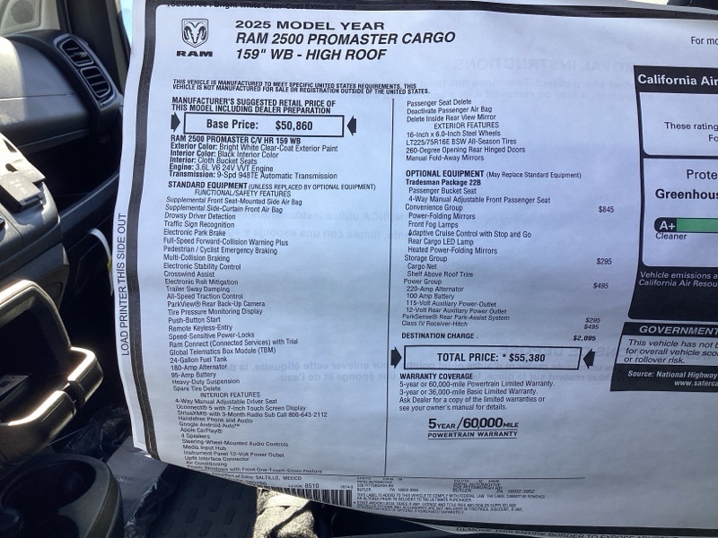 Bright White Clearcoat 2025 ProMaster 2500 Ram High Roof 3D Cargo Van FWD 9-Speed 948TE Automatic 3.6L V6 24V VVT Price includes: $2000 - 2025 National Holiday Select Inventory Bonus Cash. Exp. 01/05/2026 $2500 - 2025 National Bonus Cash . Exp. 01/05/2026