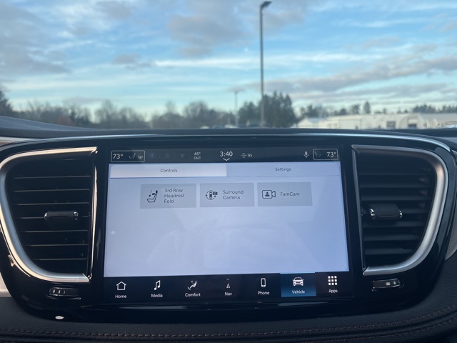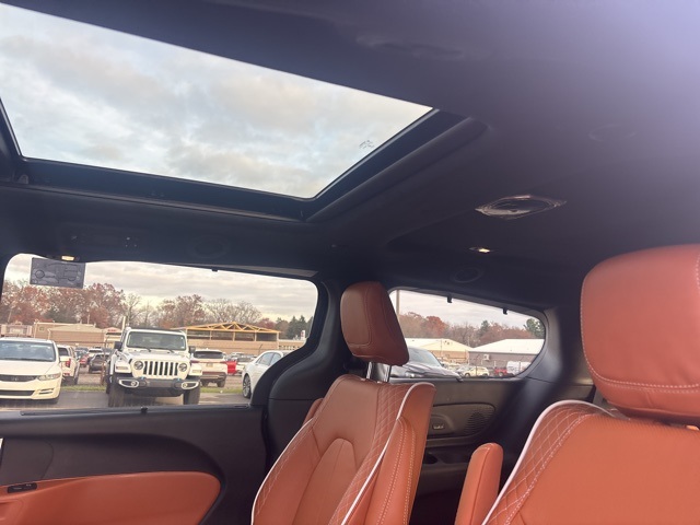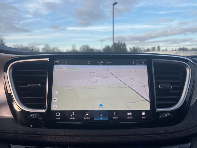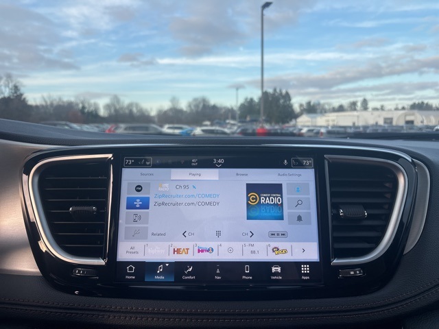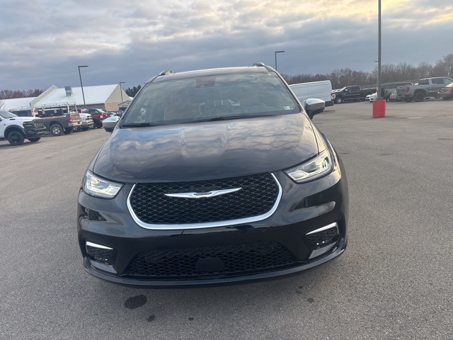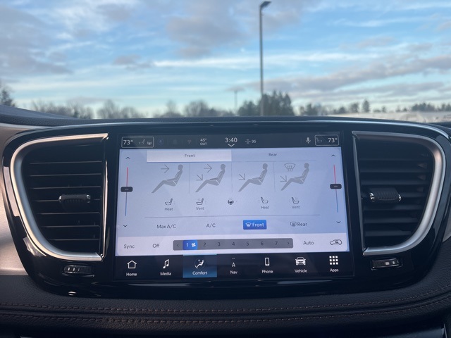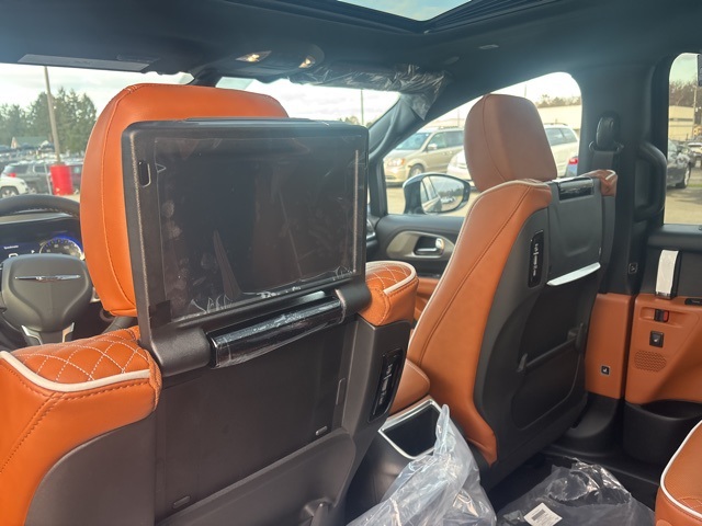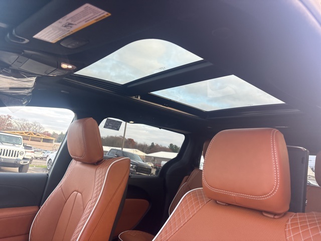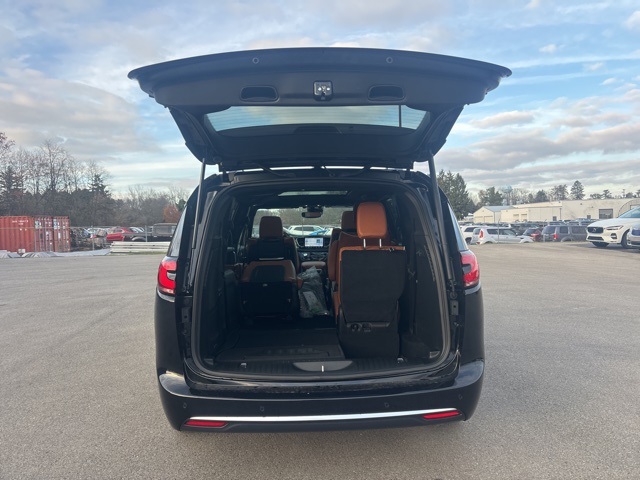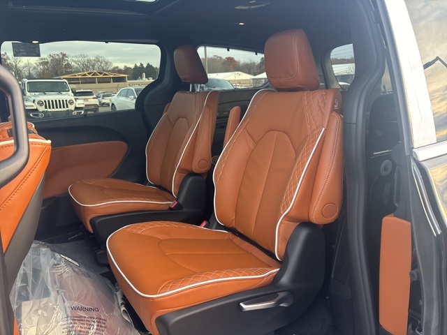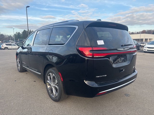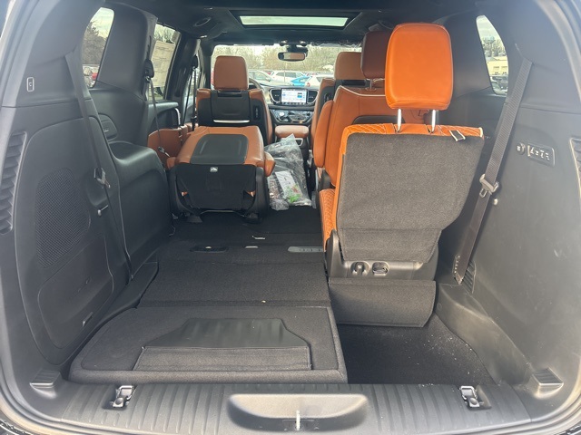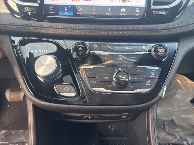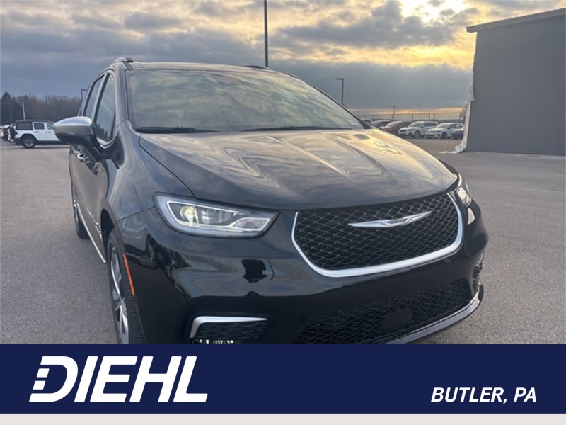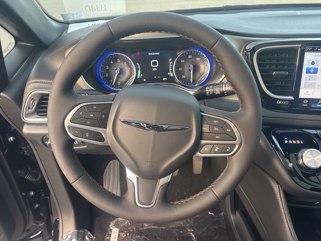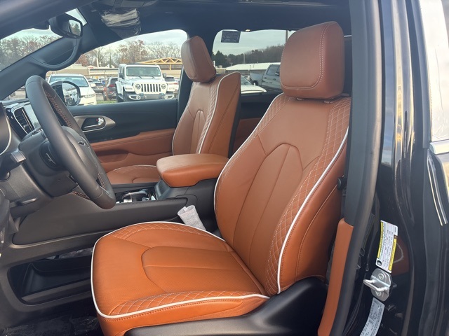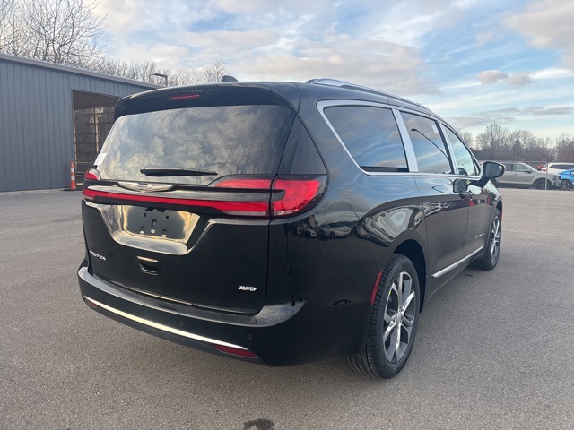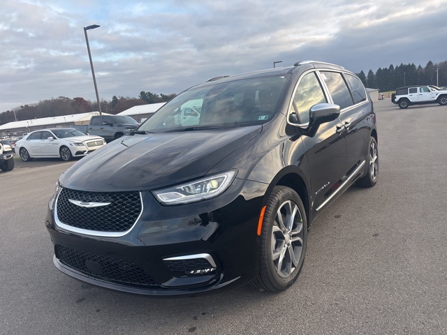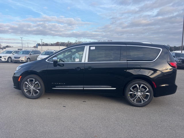 Quick Order Package 27S, 19 Speakers, 3.73 Axle Ratio, 3rd row seats: split-bench, 4-Wheel Disc Brakes, A/V remote, ABS brakes, Air Conditioning, Alloy wheels, AM/FM radio: SiriusXM 360L, Apple CarPlay/Android Auto, Audio memory, Auto-dimming door mirrors, Auto-dimming Rear-View mirror, Automatic temperature control, AWD Suspension, Bodyside moldings, Brake assist, Bumpers: body-color, Compass, Delay-off headlights, Driver door bin, Driver vanity mirror, Dual front impact airbags, Dual front side impact airbags, Electronic Stability Control, Emergency communication system: Chrysler Connect, Four wheel independent suspension, Front anti-roll bar, Front Bucket Seats, Front Center Armrest, Front dual zone A/C, Front fog lights, Front reading lights, Fully automatic headlights, Garage door transmitter, harman/kardon® Speakers, Headphones, Heated door mirrors, Heated front seats, Heated rear seats, Heated steering wheel, Illuminated entry, Knee airbag, Low tire pressure warning, Lumbar Pillow, Memory seat, Navigation System, Occupant sensing airbag, Outside temperature display, Overhead airbag, Overhead console, Panic alarm, ParkView Rear Back-Up Camera, Passenger door bin, Passenger vanity mirror, Power door mirrors, Power driver seat, Power Liftgate, Power moonroof, Power passenger seat, Power steering, Power windows, Premium Leather Trimmed Bucket Seats, Radio data system, Radio: Uconnect 5 Nav w/10.1" Display, Rain sensing wipers, Rear air conditioning, Rear reading lights, Rear window defroster, Rear window wiper, Reclining 3rd row seat, Remote keyless entry, Roof rack, Security system, Sepia Seat Color, Speed control, Split folding rear seat, Spoiler, Steering wheel mounted audio controls, Tachometer, Telescoping steering wheel, Tilt steering wheel, Traction control, Trip computer, Turn signal indicator mirrors, Variably intermittent wipers, Ventilated front seats, Voltmeter, and Wheels: 20" x 7.5" Paint/Polish Aluminum Design 2. Diamond Black Crystal Pearlcoat 2026 Chrysler Pacifica Pinnacle AWD 9-Speed 948TE Automatic 3.6L V6 24V VVT