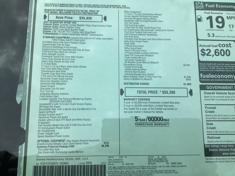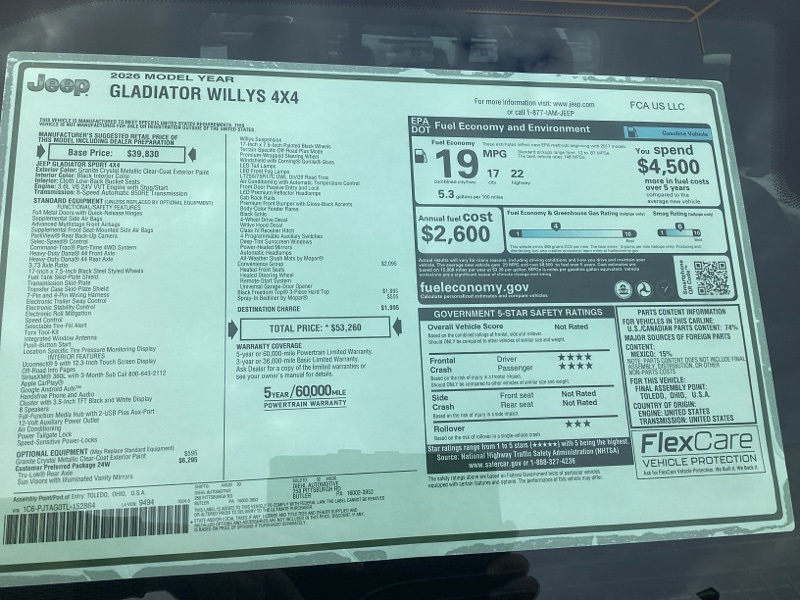 Granite Crystal Metallic Clearcoat 2026 Gladiator Jeep Willys 4D Crew Cab 4WD 8-Speed Automatic 3.6L V6 24V VVT Price includes: $500 - 2026 National Select Inventory Bonus Cash. Exp. 01/04/2027