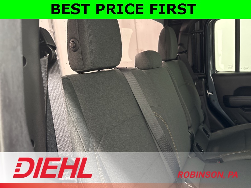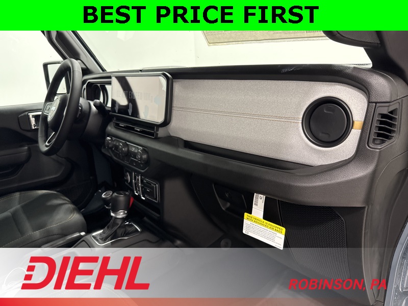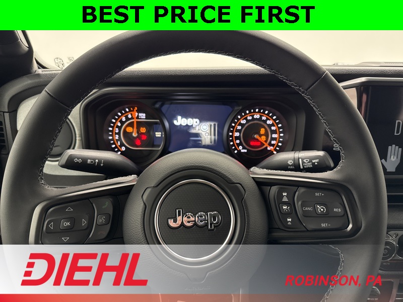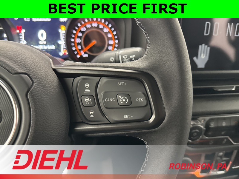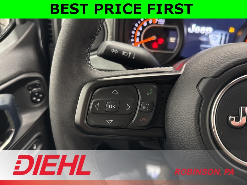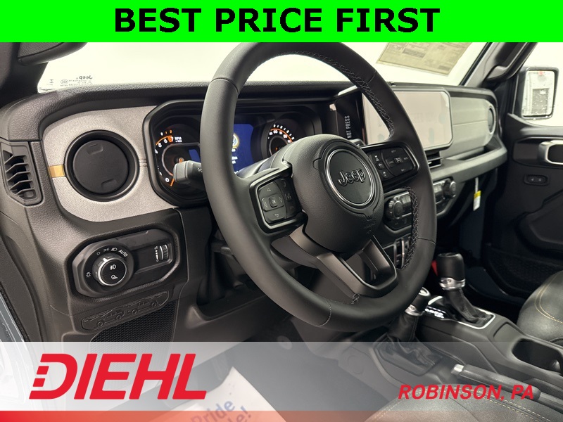 Inside, you’ll find the perfect balance between rugged and refined. The black cloth interior features the latest 12.3-inch Uconnect 5 touchscreen, Apple CarPlay and Android Auto integration, and voice-activated navigation that actually listens. Dual-zone automatic climate control, power windows and locks, and a wrapped steering wheel bring modern comfort to this trail legend.