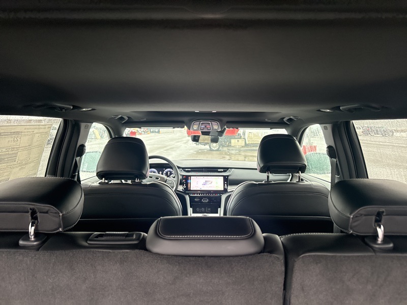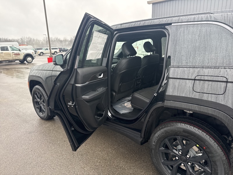The bold look comes from the Laredo Altitude Appearance Package and Quick Order Package 2BB Laredo Altitude, featuring gloss black exterior mirrors, dark neutral metallic accents, body-color door handles, dual exhaust tips, delete Laredo badge, a black headliner, and 18" fully painted aluminum wheels. Inside, Capri leatherette/suede seats and an-Teak/satin chrome accents set the tone, while heated front seats, a heated steering wheel, power driver seat, power liftgate, power sunroof, remote start, a 115V auxiliary power outlet, and a wireless charging pad elevate everyday comfort.