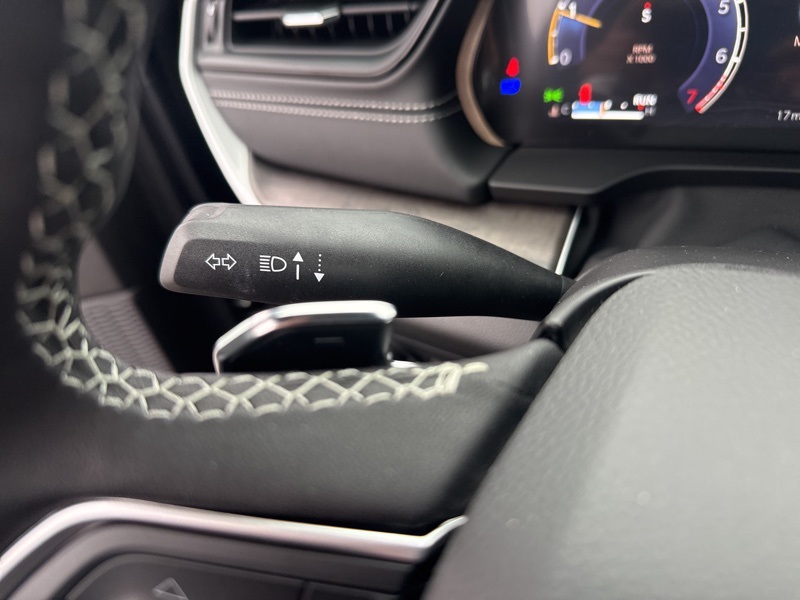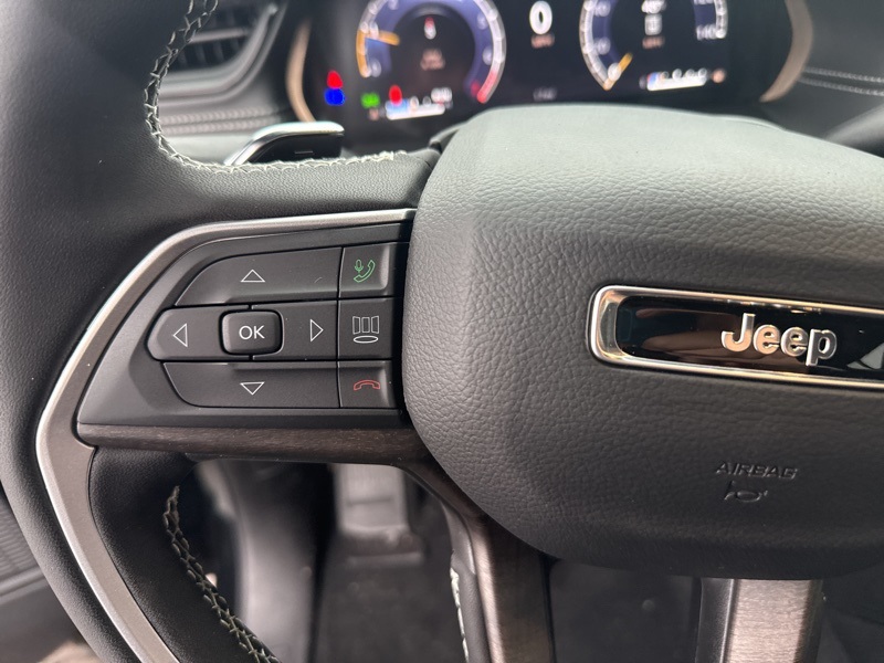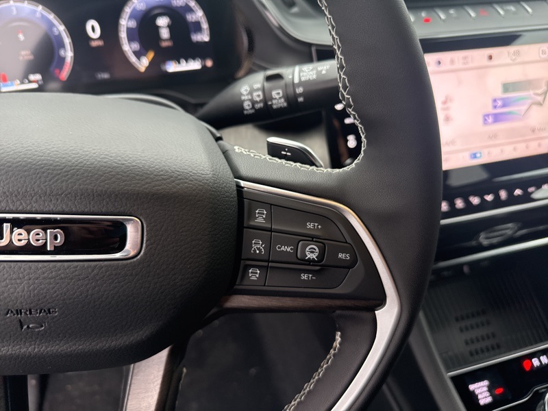 Tech takes center stage with Uconnect 5 Nav on a 12.3" touchscreen, built-in GPS navigation, SiriusXM with 360L, HD Radio, Apple CarPlay and Android Auto, integrated voice command with Bluetooth, connected travel and traffic services, a 4G LTE Wi-Fi hot spot, USB host flip, and a Global Telematics Box Module. Driver-assist features include Active Driving Assist, intersection collision assist, traffic sign recognition, Selec-Terrain, selectable tire fill alert, rain-sensitive windshield wipers, secondary active grille shutters, and active noise control.