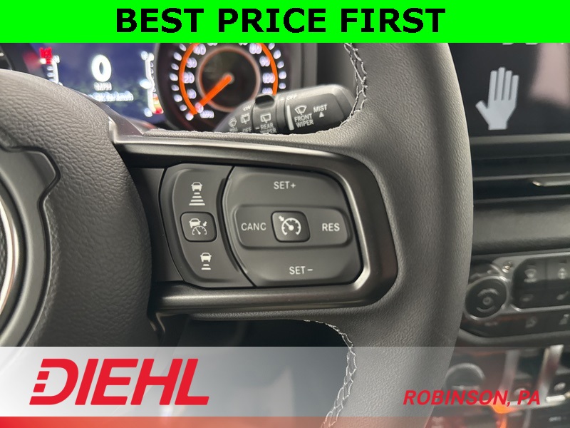 Inside, the Uconnect 5 system with a 12.3-inch touchscreen, Apple CarPlay, and Android Auto keeps you plugged in and on course, while the Advanced Safety Group adds blind spot monitoring, park assist, and adaptive cruise control for peace of mind between adventures. The Premium LED package brightens up the darkest trails, and the easy-to-remove top and doors mean open-air freedom is always an option.