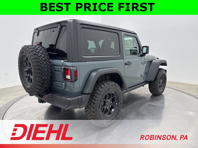 This 2-door Willys is the kind of Jeep that doesn’t just handle the elements—it thrives in them. It’s light, agile, and built to explore the unbeaten path, all while keeping you comfortable and connected. Stop waiting for “someday.” Make today the day you take home this Wrangler Willys from Diehl of Robinson before someone else drives off in your adventure. Price includes: $1500 - 2026 National Stellantis Loyalty Retail Bonus Cash . Exp. 01/05/2026 Diehl of Robinson Fast Start Rebate - $2,000 - Exp. 12/07/2025