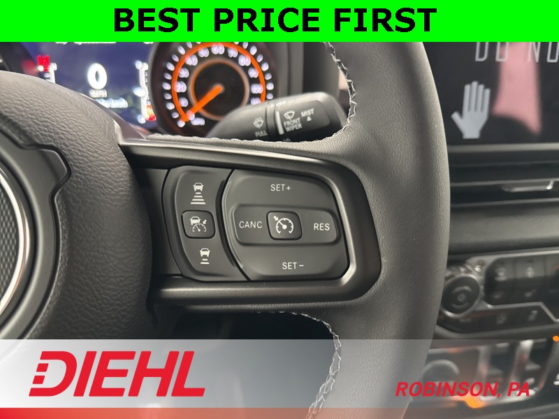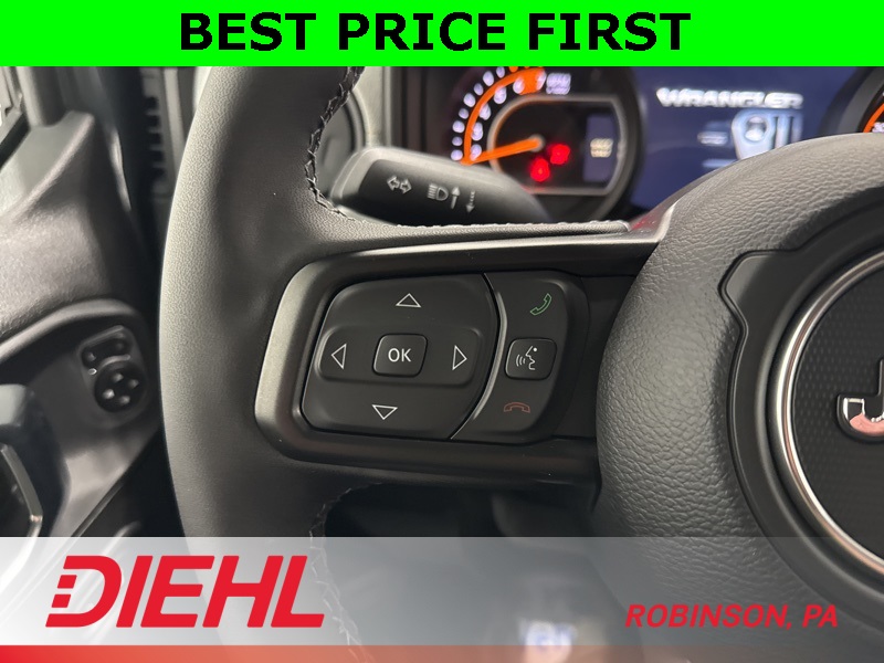 The Command-Trac 4WD system teams up with heavy-duty Dana axles, skid plates, and tow hooks for that legendary go-anywhere, do-anything Jeep confidence. Whether it’s snow, sand, or Pittsburgh’s infamous potholes, this Wrangler just laughs and keeps rolling. Inside, it’s all about comfort and connection with the Uconnect 5 system on a 12.3-inch touchscreen, Apple CarPlay, Android Auto, and a premium steering wheel that feels just right when the roof and doors are off.