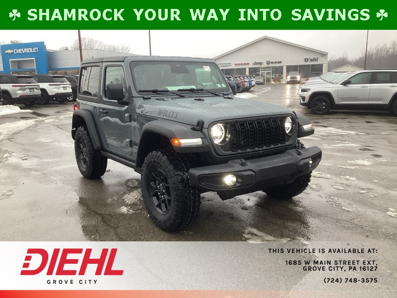 Anvil Clear Coat 2026 Wrangler Jeep Willys 2D Sport Utility 4WD 8-Speed Automatic 2.0L I4 DOHC Price includes: $1000 - 2026 National Stellantis Loyalty Bonus Cash . Exp. 03/02/2026 $500 - 2026 National 2026 First Responder Bonus Cash . Exp. 01/04/2027
