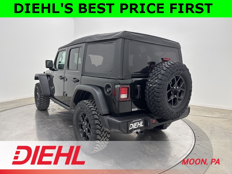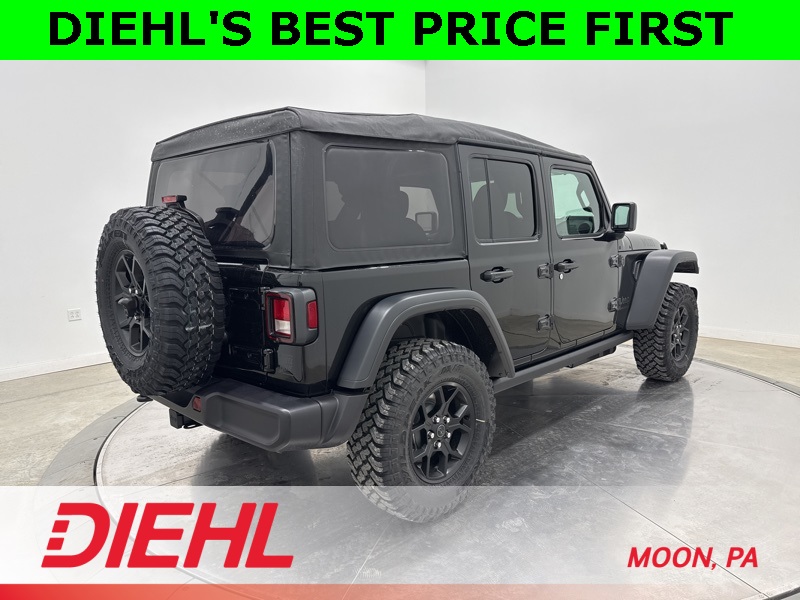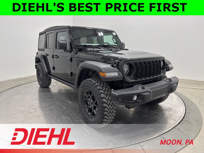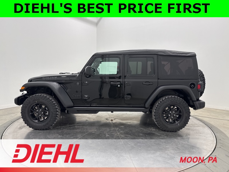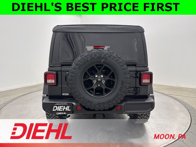 4-Wheel Drive Swing Gate Decal, 4.10 Rear Axle Ratio, 7 and 4 Pin Wiring Harness, Advanced Brake Assist, Automatic Headlamps, Auxiliary Switches, Black Grille with Gloss Black Rings, Class II Receiver Hitch, Conventional Differential Front Axle, Corning Gorilla Glass, Dana M210 Wide HD Tube Front Axle, Dana M220 Wide Rear Axle, Daytime Running Lamps LED Accents, Deep Tint Sunscreen Windows, E-Locker Rear Axle, Enhanced Adaptive Cruise Control, Front LED Fog Lamps, Full Speed Forward Collision Warning Plus, Injection Molded Black Rear Bumper, LED Premium Reflector Headlamps, Mold in Color Bumper with Gloss Black, Molded in Color Rubicon Highline Flare, MOPAR All-Weather Floor Mats, Off-Road Plus Mode, Power Dome Dual Vented Hood, Power Heated Mirrors, Premium Wrapped Steering Wheel, Quick Order Package 24W Willys, Security Alarm, Steel Power Dome Hood Package, Sun Visors with Illuminated Vanity Mirrors, Wheels: 17" x 7.5" Painted Black, Willy's Suspension, Willys Hood Decal. Price includes: $1500 - 2026 National Stellantis Loyalty Retail Bonus Cash . Exp. 02/02/2026 $2000 - 2026 National Select Inventory Bonus Cash. Exp. 01/04/2027 $500 - 2026 National 2026 First Responder Bonus Cash . Exp. 01/04/2027 $1,500 - Exp. 02/02/2026