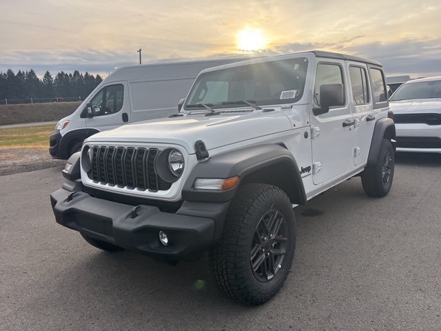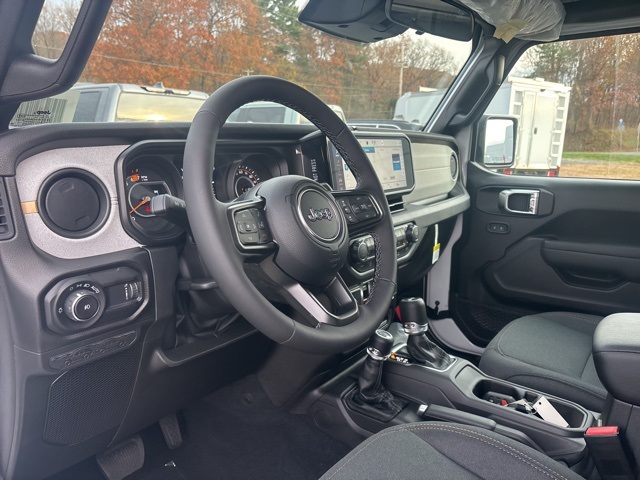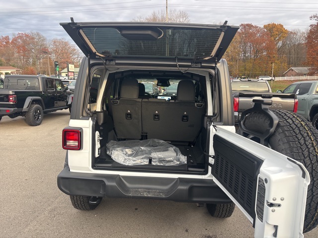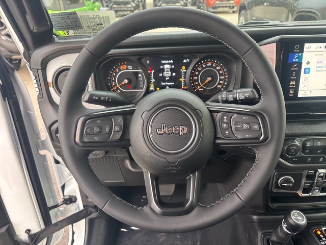 Convenience Group (2-Door Passive Entry, Front Door Locks, Air Conditioning with Auto Temp Control, Air Filtering, Cluster 7.0" TFT Color Display, Emergency/Assistance Call, Heated Front Seats, Heated Steering Wheel, and Universal Garage Door Opener), Quick Order Package 22S Sport S (Advanced Brake Assist, Automatic Headlamps, Corning Gorilla Glass, Deep Tint Sunscreen Windows, Enhanced Adaptive Cruise Control, Full Speed Forward Collision Warning Plus, Power Heated Mirrors, Premium Wrapped Steering Wheel, Security Alarm, Sun Visors with Illuminated Vanity Mirrors, and Wheels: 17" x 7.5" Gray), 12.3" Touchscreen Display, 3.45 Overall Top Gear Ratio, 4-Wheel Disc Brakes, 4G LTE Wi-Fi Hot Spot, 8 Speakers, ABS brakes, Air Conditioning, AM/FM radio: SiriusXM with 360L, Apple CarPlay, Apple CarPlay/Android Auto, Aux Battery, Black 3-Piece Hard Top, Brake assist, Cloth Low-Back Bucket Seats, Compass, Connectivity - US/Canada, Delay-off headlights, Driver door bin, Driver vanity mirror, Dual front impact airbags, Dual front side impact airbags, Electronic Stability Control, For More Info, Call 800-643-2112, Freedom Panel Storage Bag, Front anti-roll bar, Front Bucket Seats, Front Center Armrest w/Storage, Front fog lights, Front reading lights, Google Android Auto, Illuminated entry, Integrated Center Stack Radio, Integrated roll-over protection, Low tire pressure warning, MOPAR All-Weather Floor Mats, Non-Lock Fuel Cap Without Discriminator, Normal Duty Suspension, Occupant sensing airbag, Outside temperature display, Overhead airbag, Panic alarm, ParkView Rear Back-Up Camera, Passenger door bin, Passenger vanity mirror, Power steering, Power windows, Radio data system, Radio: Uconnect 5 with 12.3" Display, Rear anti-roll bar, Rear reading lights, Rear Window Defroster, Rear Window Wiper/Washer, Remote keyless entry, SiriusXM Radio Service, SiriusXM with 360L, Speed control, Split folding rear seat, Steering wheel mounted audio controls, Stop-Start Dual Battery System, Tachometer, Telescoping steering wheel, Tilt steering wheel, Traction control, Trip computer, Variably intermittent wipers, and Wheels: 17" x 7.5" Black Steel Styled. Bright White Clearcoat 2026 Jeep Wrangler Sport S 4WD 8-Speed Automatic 2.0L I4 DOHC