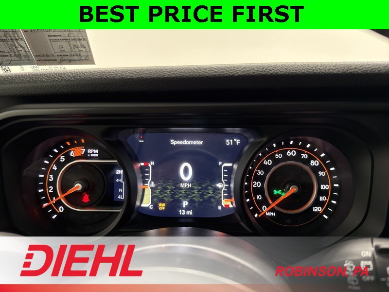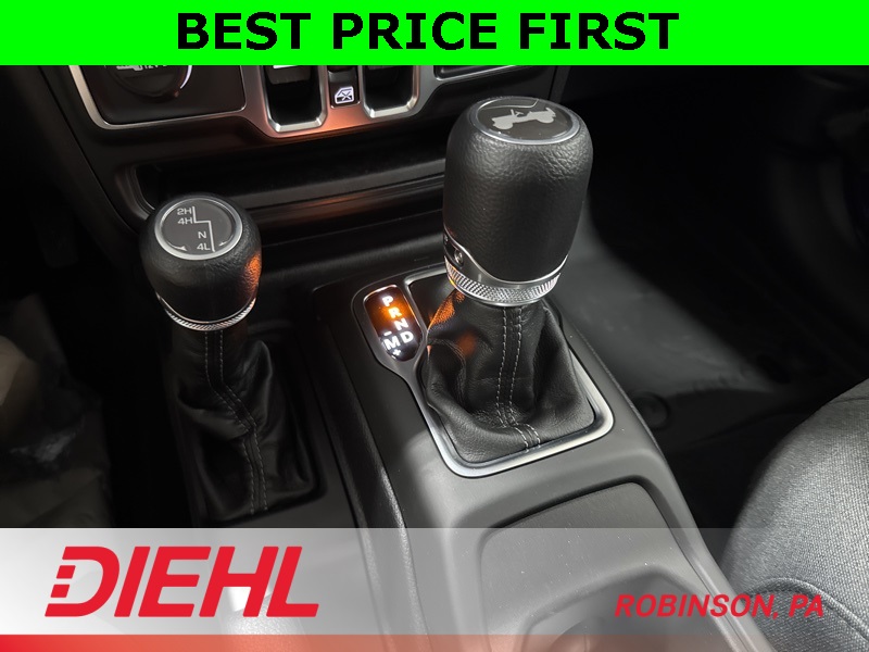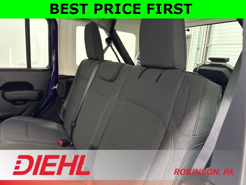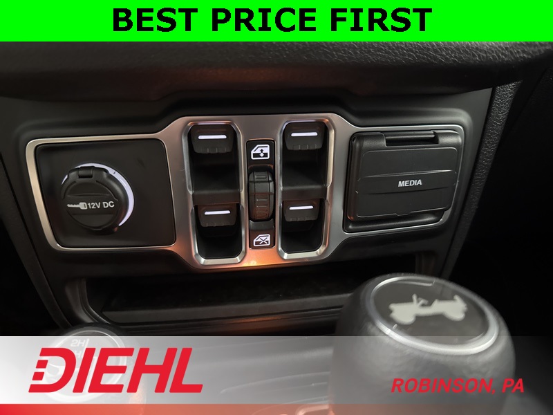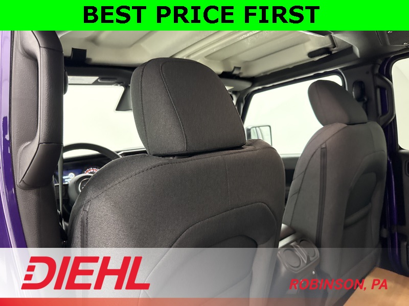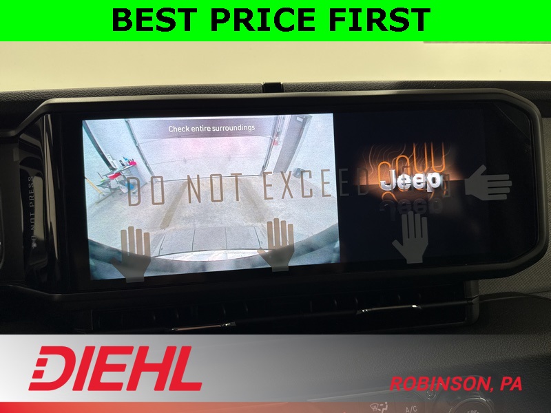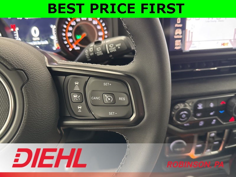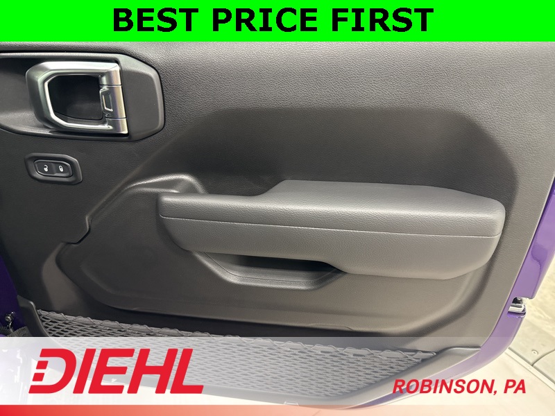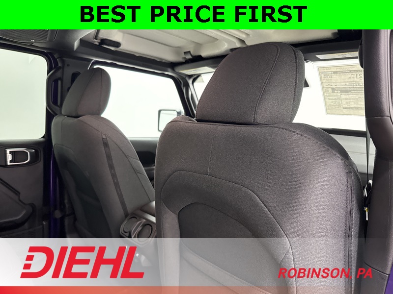 On the outside, this Wrangler stays unmistakably Jeep with 17-inch black steel styled wheels, a black Sunrider soft top, removable doors with quick-release hinges, and classic Wrangler lines that haven’t needed changing for decades. Safety features include adaptive cruise control, forward collision warning with active braking, ParkView rear backup camera, and advanced multistage airbags, giving you confidence without overcomplicating the drive.