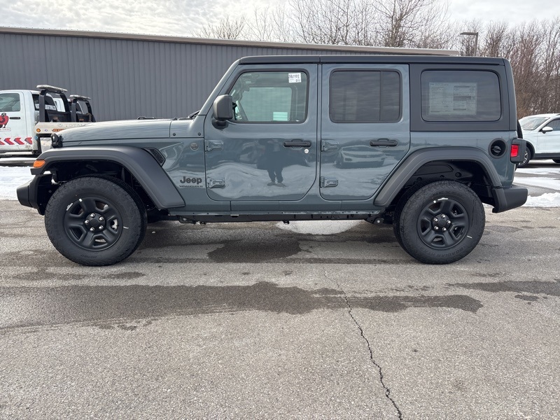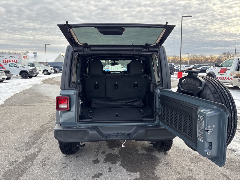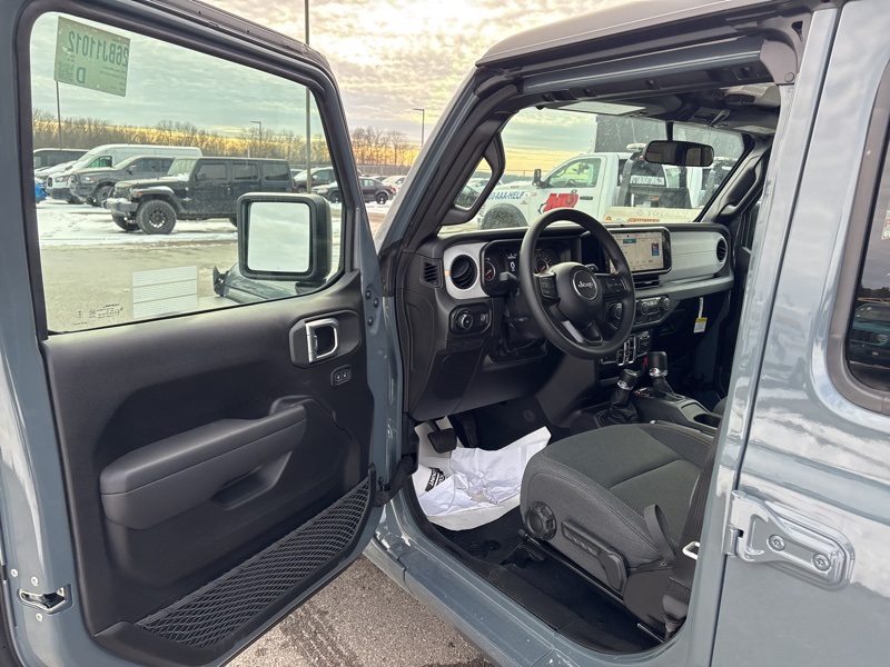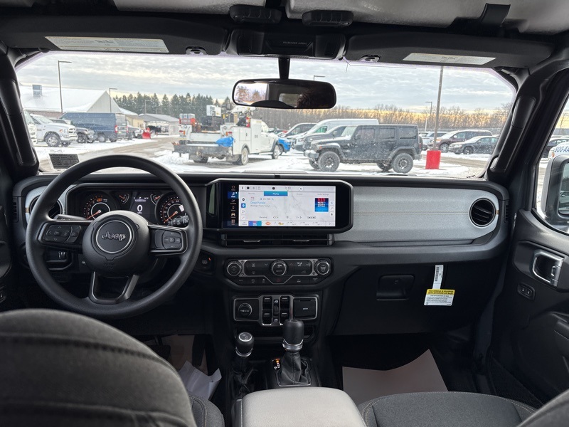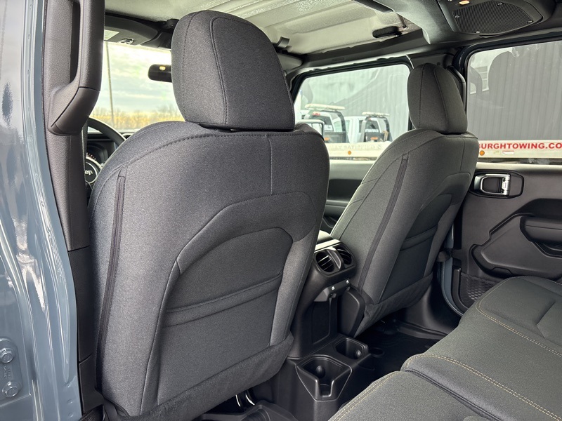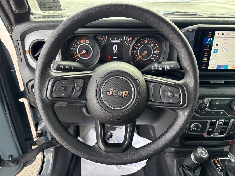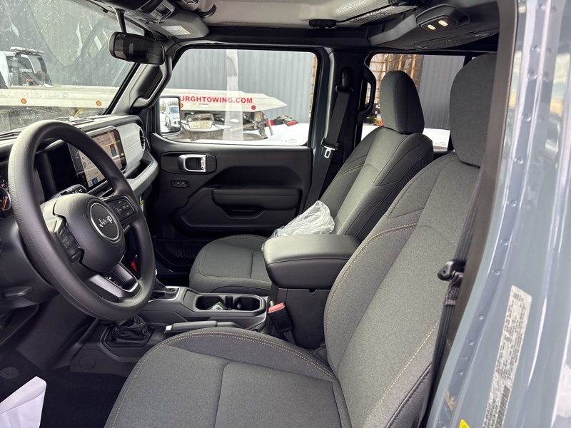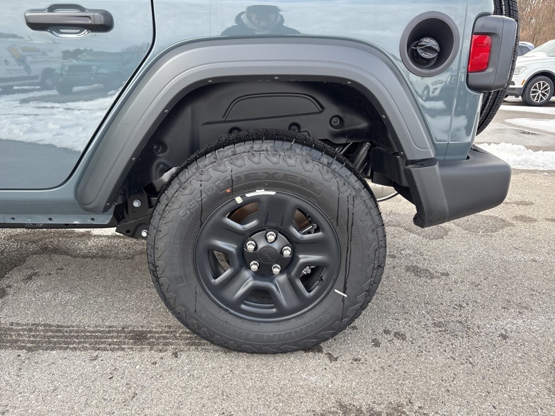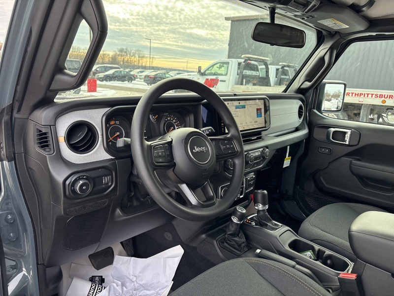 Quick Order Package 22B Sport, 12.3" Touchscreen Display, 3.45 Overall Top Gear Ratio, 4-Wheel Disc Brakes, 4G LTE Wi-Fi Hot Spot, 8 Speakers, ABS brakes, Air Conditioning, AM/FM radio: SiriusXM with 360L, Apple CarPlay, Apple CarPlay/Android Auto, Aux Battery, Black 3-Piece Hard Top, Brake assist, Cloth Low-Back Bucket Seats, Compass, Connectivity - US/Canada, Deep Tint Sunscreen Windows, Delay-off headlights, Driver door bin, Driver vanity mirror, Dual front impact airbags, Dual front side impact airbags, Electronic Stability Control, For More Info, Call 800-643-2112, Freedom Panel Storage Bag, Front anti-roll bar, Front Bucket Seats, Front Center Armrest w/Storage, Front fog lights, Front reading lights, Google Android Auto, Illuminated entry, Integrated Center Stack Radio, Integrated roll-over protection, Low tire pressure warning, MOPAR All-Weather Floor Mats, Non-Lock Fuel Cap Without Discriminator, Normal Duty Suspension, Occupant sensing airbag, Outside temperature display, Overhead airbag, Panic alarm, ParkView Rear Back-Up Camera, Passenger door bin, Passenger vanity mirror, Power steering, Power windows, Radio data system, Radio: Uconnect 5 with 12.3" Display, Rear anti-roll bar, Rear reading lights, Rear Window Defroster, Rear Window Wiper/Washer, Remote keyless entry, SiriusXM Radio Service, SiriusXM with 360L, Speed control, Split folding rear seat, Steering wheel mounted audio controls, Stop-Start Dual Battery System, Tachometer, Telescoping steering wheel, Tilt steering wheel, Traction control, Trip computer, Variably intermittent wipers, and Wheels: 17" x 7.5" Black Steel Styled. Anvil Clear Coat 2026 Jeep Wrangler Sport 4WD 8-Speed Automatic 2.0L I4 DOHC