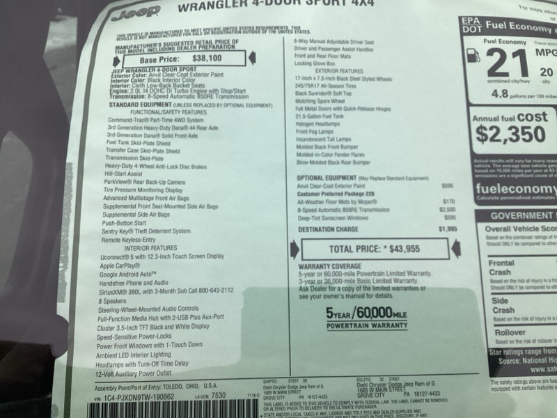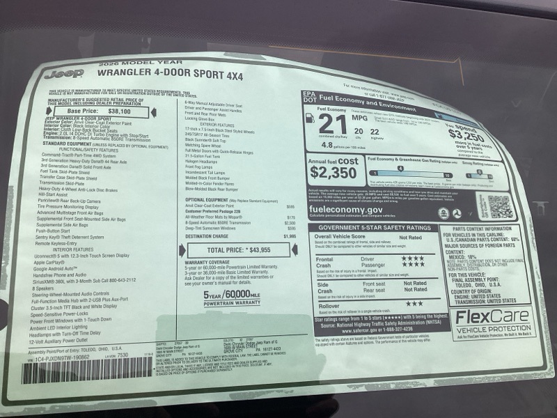 Anvil Clear Coat 2026 Wrangler Jeep Sport 4D Sport Utility 4WD 8-Speed Automatic 2.0L I4 DOHC