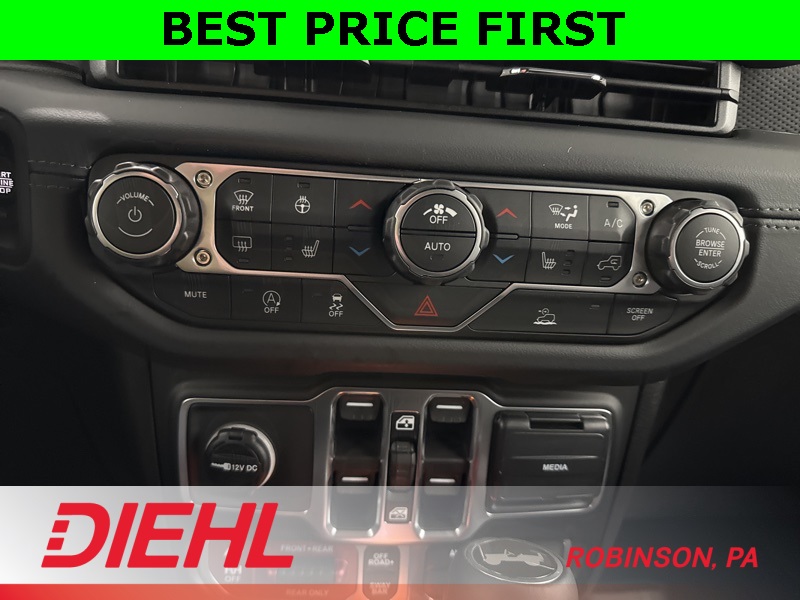 Inside, the Rubicon blends rugged durability with unexpected refinement. The leatherette interior, 12.3 inch touchscreen with Apple CarPlay and Android Auto, digital gauge cluster, premium audio, integrated off road pages, and full suite of modern Jeep tech make it a comfortable daily driver even when you’re not climbing rocks. Heated seats, a heated steering wheel, automatic temperature control, and remote start (when paired with the hard top) add comfort to the capability.