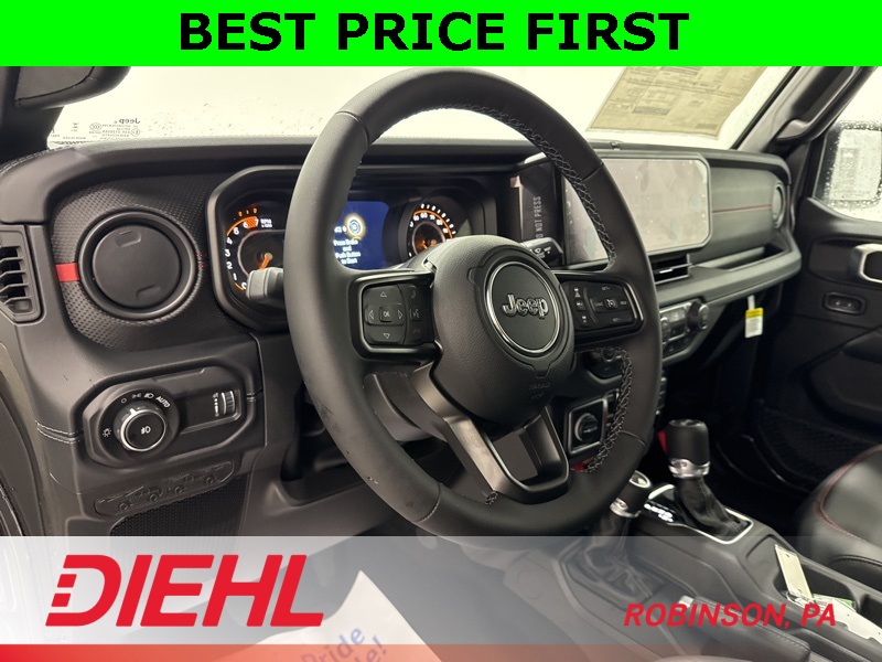 The Granite Crystal Metallic clear-coat paint over the black interior gives it a clean, stealthy look, while the premium soft top, hard-top headliner, and upgraded electrical/switch package make it ready for any combination of weather, off-road gear, or accessories you want to throw at it. Inside, you get the 12.3-inch touchscreen, digital gauge cluster, heated seats, heated wheel, remote start, premium audio, and all the modern tech that makes daily driving surprisingly civilized for something that can literally climb a wall. With the 2.0L turbo and 8-speed automatic, it’s powerful, efficient enough not to cry at the pump, and smooth everywhere except the places you deliberately go to avoid smoothness.