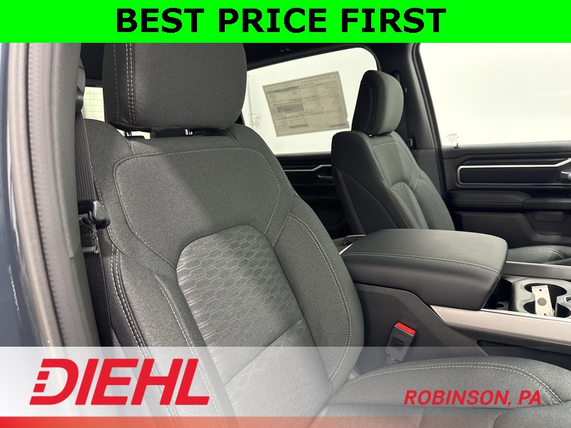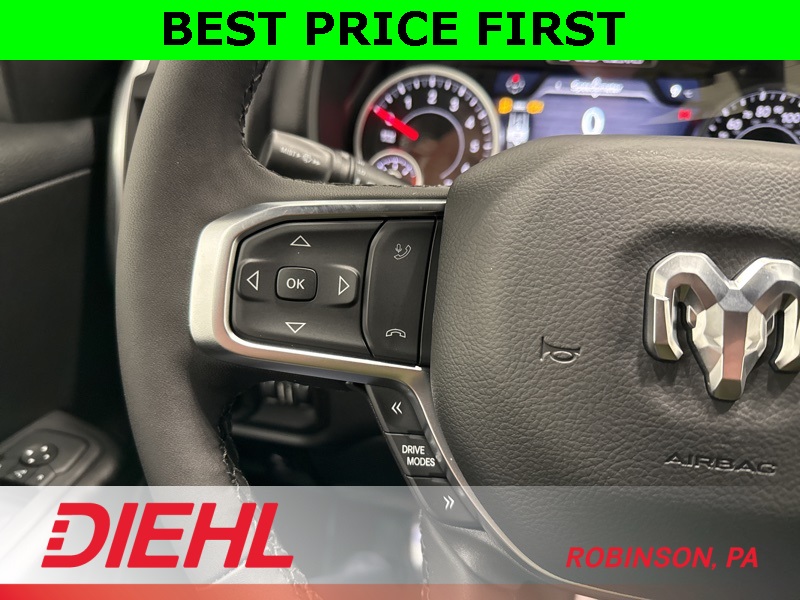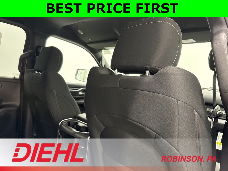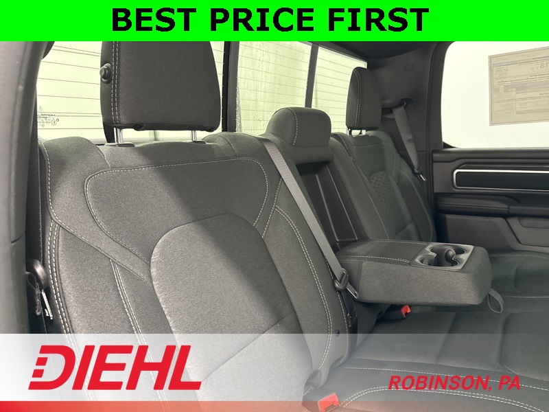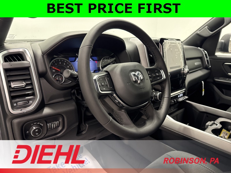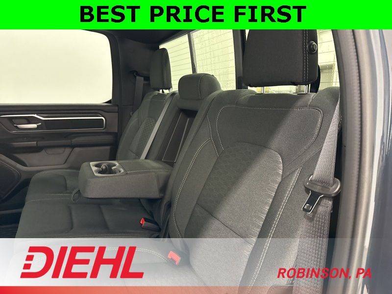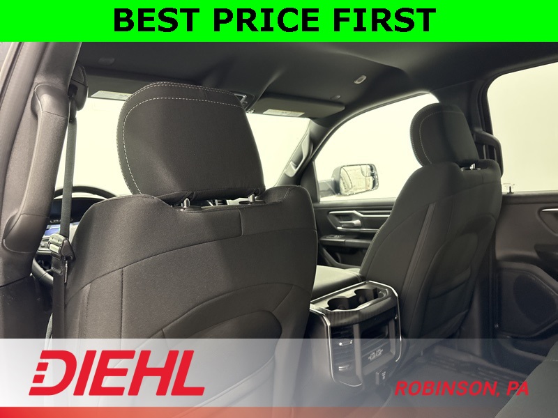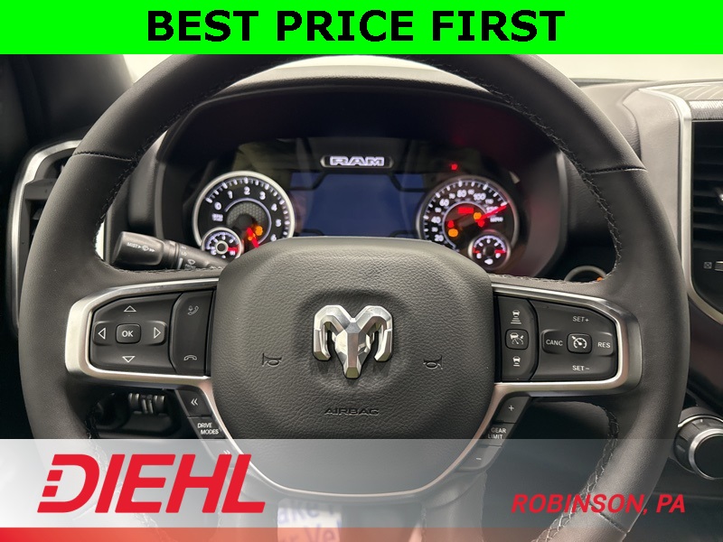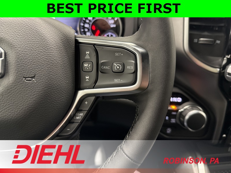 Inside, this Big Horn punches well above its weight class. The large touchscreen with Apple CarPlay and Android Auto keeps navigation, music, and calls right where you want them, while dual-zone automatic climate control makes sure everyone stays comfortable regardless of seat assignment. Power-adjustable seating, a leather-wrapped steering wheel, heated seats, and heated steering wheel turn long drives into something you actually look forward to. And with the Crew Cab, the back seat isn’t an afterthought — there’s plenty of real space for adults, kids, gear, or all three at once.