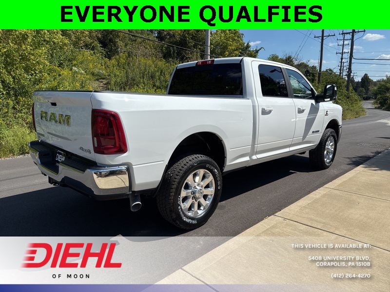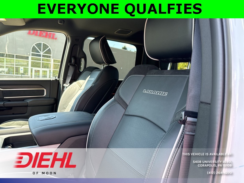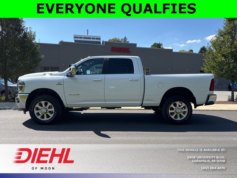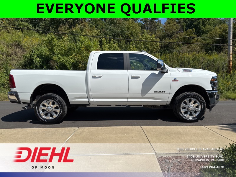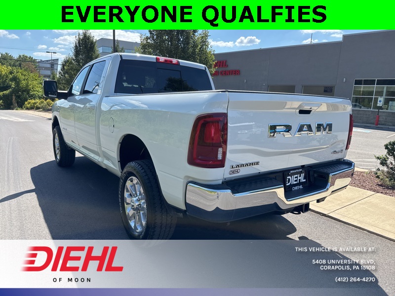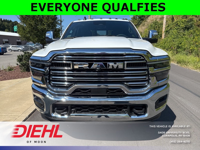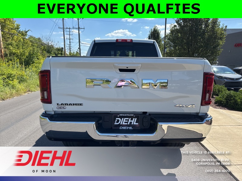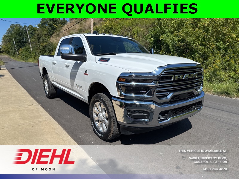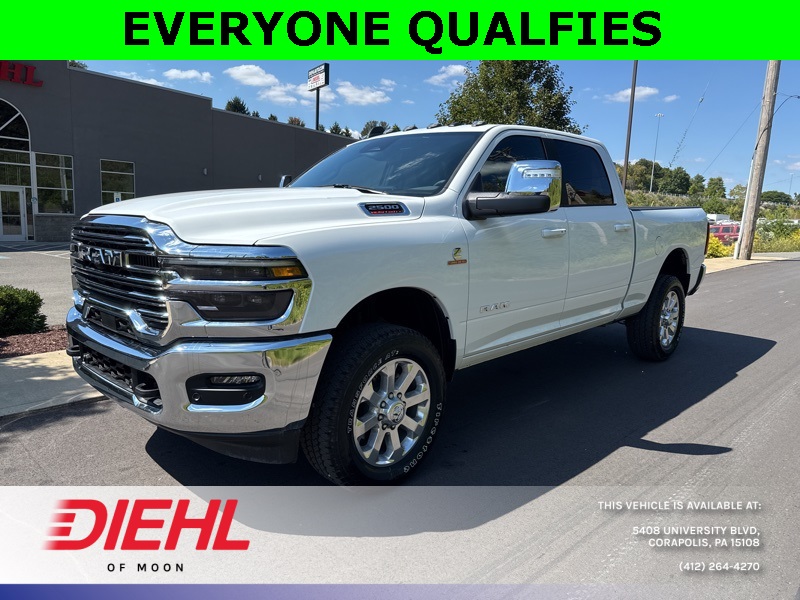 Meet the 2026 Ram 2500 Laramie Crew Cab 4x4, a truck so mighty it practically growls when you open the door. Painted in Bright White Clearcoat with a sleek black interior, this heavy-duty workhorse is ready to conquer Pittsburgh job sites, haul weekend toys to the Allegheny River, or simply turn heads on your commute through Moon Township. Under the hood roars the legendary 6.7L Cummins Turbo Diesel engine paired with a smooth 6-speed automatic, delivering torque so impressive it could probably tow Heinz Field if someone forgot to pay the parking bill.Step inside and youre greeted by luxury that rivals some high-end sedans. The Uconnect 12-inch touchscreen infotainment system offers navigation, Apple CarPlay, Android Auto, and a 17-speaker Harman Kardon premium audio system that makes every playlist sound like a live concert in your cab. Heated and ventilated front seats with memory settings, heated second-row seats, dual-zone automatic climate control, and a leather-wrapped steering wheel make even steel-town winters feel like a vacation.This Ram isnt just brawn and comfortits also smart. ParkSense front and rear park-assist, adaptive cruise control with stop, blind-spot detection, and trailer reverse guidance all come together to make towing a breeze. Speaking of towing, with the Max Tow Package, Gooseneck Prep Group, and a Class V receiver hitch, youre looking at a 11,400-pound GVWR beast built for serious hauling. Polished 20-inch aluminum wheels and chrome accents round out the package, because yes, power should look good too.If youve been searching for the best new 2026 Ram 2500 for sale in Pittsburgh or the most competitive truck deals near Moon Township, PA, youve found your champion. Stop by Diehl Chrysler Jeep Dodge Ram, the premier Ram dealership in Western PA, and take this Laramie for a spin. Trust usonce you drive it, youll wonder how you ever lived without it.Disclaimer:New vehicle pricing includes all offers and incentives. Tax, Title and Tags not included in vehicle prices shown and must be paid by the purchaser. While great effort is made to ensure the accuracy of the information on this site, errors do occur so please verify information with a customer service rep. This is easily done by calling us at (412)-264-4270 or by visiting us at the dealership.All pricing and details are believed to be accurate, but we do not warrant or guarantee such accuracy. The prices shown above, may vary from region to region, as will incentives, and are subject to change. Vehicle information is based off standard equipment and may vary from vehicle to vehicle. Call or email for complete vehicle specific information. $2,000 - Exp. 10/01/2025