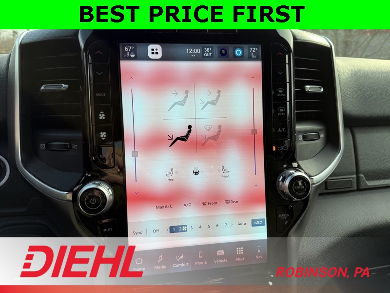 Inside, the cabin is comfortable and well-equipped with premium cloth seating, heated front seats, heated steering wheel, dual-zone automatic climate control, and a 40/20/40 split front bench seat for added versatility. The Uconnect 5 system with an 8.4-inch touchscreen keeps everything connected with Apple CarPlay, Android Auto, SiriusXM, voice command, and a 4G LTE Wi-Fi hotspot, while the Alpine premium audio system with subwoofer delivers rich, powerful sound.