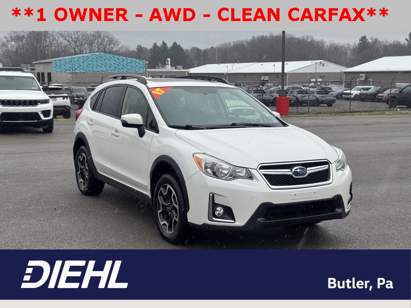 **ALL WHEEL DRIVE**, **BLUETOOTH HANDS FREE PHONE**, **LEATHER**, **MOONROOF**, **BACK-UP CAMERA**, **LOW LOW MILES**, **CLEAN CARFAX ONE OWNER**, **KEYLESS ENTRY**, **NAVIGATION SYSTEM**, **FOG LAMPS**, **BLIND SPOT DETECTION**, **HEATED POWER OUTSIDE MIRRORS**, **AUTO HIGH BEAMS**, **HEATED FRONT SEATS**, **SECURITY SYSTEM**, **FACTORY NAVIGATION**, **17" ALLOY WHEELS**, 17" x 7.0J Aluminum Alloy Wheels, 4-Wheel Disc Brakes, ABS brakes, Alloy wheels, Brake assist, Dual front impact airbags, Dual front side impact airbags, Electronic Stability Control, Emergency communication system, Front anti-roll bar, Keyless Access w/Push-Button Start, Knee airbag, Low tire pressure warning, Occupant sensing airbag, Overhead airbag, Rear anti-roll bar. Recent Arrival! CARFAX One-Owner. Clean CARFAX. Crystal White Pearl 2017 Subaru Crosstrek 2.0i Limited AWD Lineartronic CVT 2.0L 16V DOHC