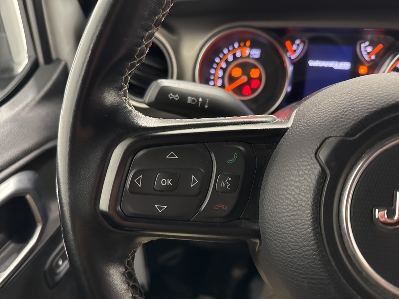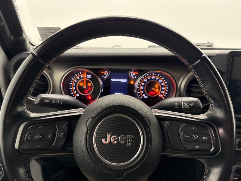 Under the hood, the 3.6L V6 paired with an 8 speed automatic transmission delivers smooth power whether you are cruising the highway or heading toward something a little less paved. Part time four wheel drive, a manual transfer case, skid plates, tow hooks, and all terrain tires give this Wrangler the confidence to handle weather, trails, and weekend plans without hesitation. It drives like a Jeep should, solid, capable, and always ready for the next turn.
