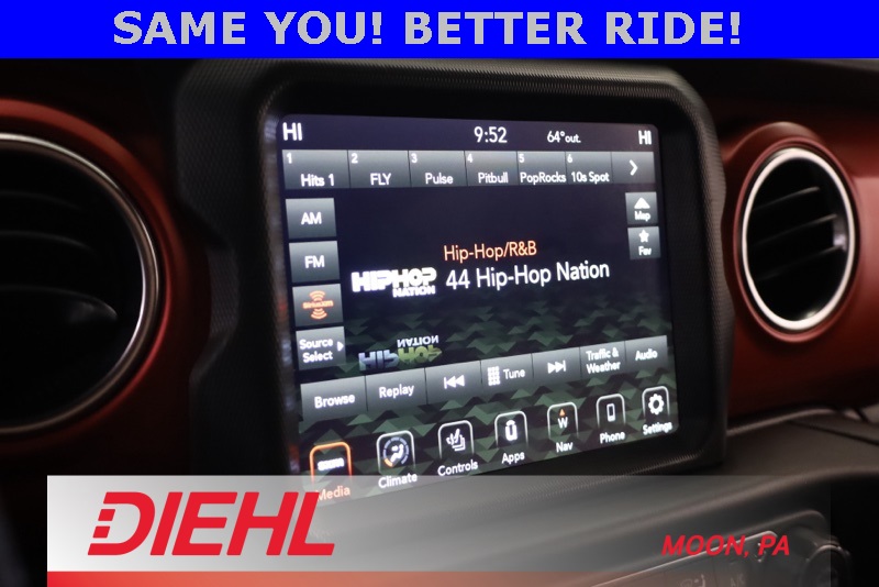Inside, cloth bucket seats, a leather steering wheel, and smart storage throughout keep things functional without losing charm. Technology steps in with navigation, Bluetooth, HD radio, premium audio, WiFi hotspot capability, smart device integration, and two front LCD monitors that make the cabin feel unexpectedly modern for something wearing a removable top. Remote start adds a little luxury to your routine, while the backup camera, stability control, and a full suite of airbags help keep every trip reassuringly safe.