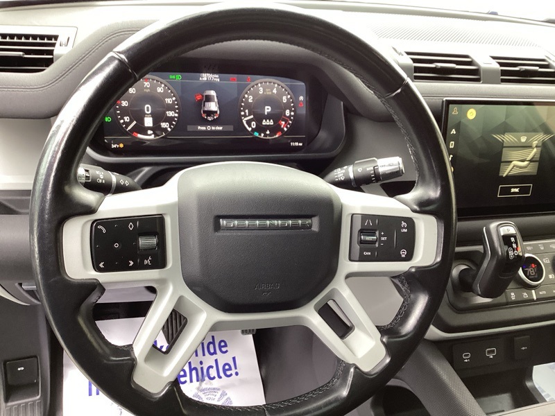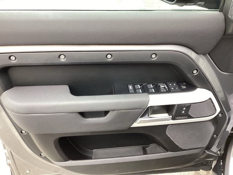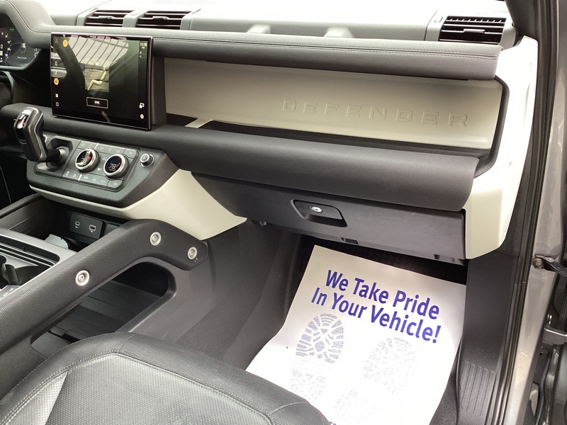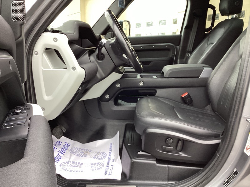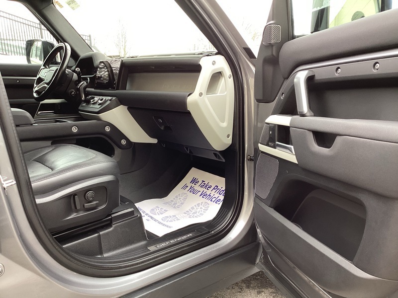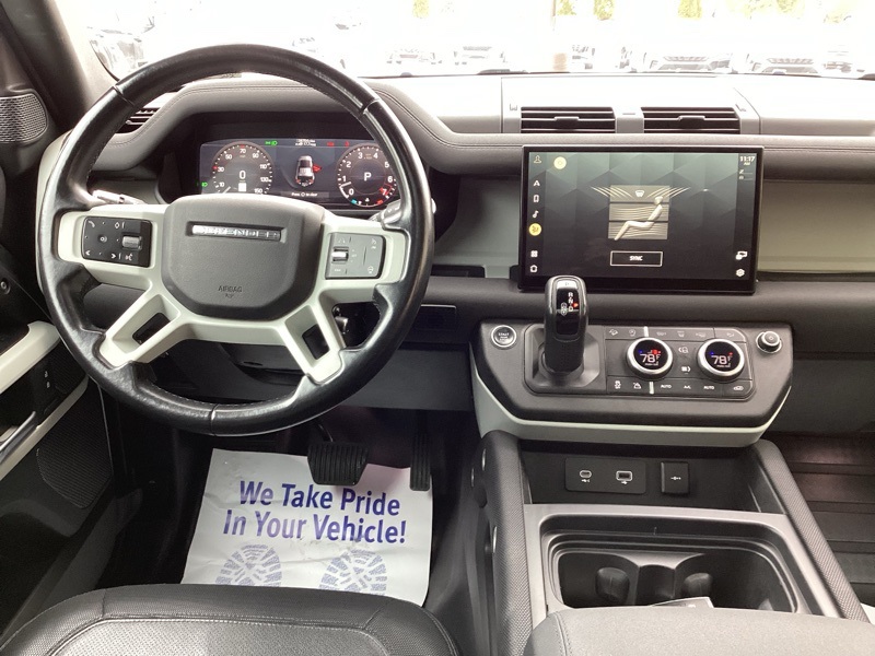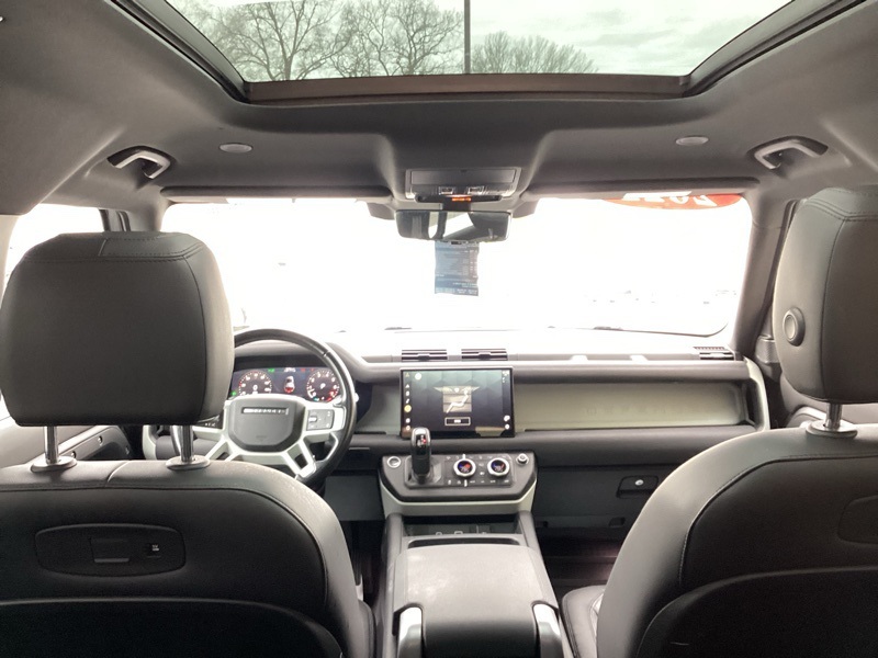 14-Way Heated Electric Memory Seats, 15 Speakers, 3.55 Axle Ratio, 4-Wheel Disc Brakes, ABS brakes, Air Conditioning, Alloy wheels, AM/FM radio: SiriusXM, Apple CarPlay & Android Auto, Auto High-beam Headlights, Auto tilt-away steering wheel, Auto-dimming Rear-View mirror, Automatic temperature control, Brake assist, Bumpers: body-color, Compass, Delay-off headlights, Driver door bin, Driver vanity mirror, Dual front impact airbags, Dual front side impact airbags, Electronic Stability Control, Four wheel independent suspension, Front anti-roll bar, Front Bucket Seats, Front Center Armrest, Front dual zone A/C, Front fog lights, Front reading lights, Fully automatic headlights, Garage door transmitter: HomeLink, Grained Leather Seat Trim, Heated door mirrors, Heated front seats, Illuminated entry, Leather Shift Knob, Leather steering wheel, Low tire pressure warning, Memory seat, Navigation system: Connected Navigation PIVI Pro, Occupant sensing airbag, Outside temperature display, Overhead airbag, Overhead console, Panic alarm, Passenger door bin, Passenger vanity mirror, Power door mirrors, Power driver seat, Power moonroof, Power passenger seat, Power steering, Power windows, Radio data system, Radio: 825W 15 Speaker Meridian Surround Sound Sys, Rain sensing wipers, Rear anti-roll bar, Rear fog lights, Rear reading lights, Rear seat center armrest, Rear window defroster, Rear window wiper, Remote keyless entry, Roof rack: rails only, Security system, Speed control, Speed-sensing steering, Speed-Sensitive Wipers, Split folding rear seat, Steering wheel memory, Steering wheel mounted audio controls, Tachometer, Telescoping steering wheel, Tilt steering wheel, Traction control, Trip computer, Variably intermittent wipers, Weather band radio, Wheels: 20" Satin Dark Grey Style 5094. Carpathian Gray Premium Metallic 2022 Land Rover Defender 110 X-Dynamic SE 4WD 8-Speed Automatic 3.0L I6