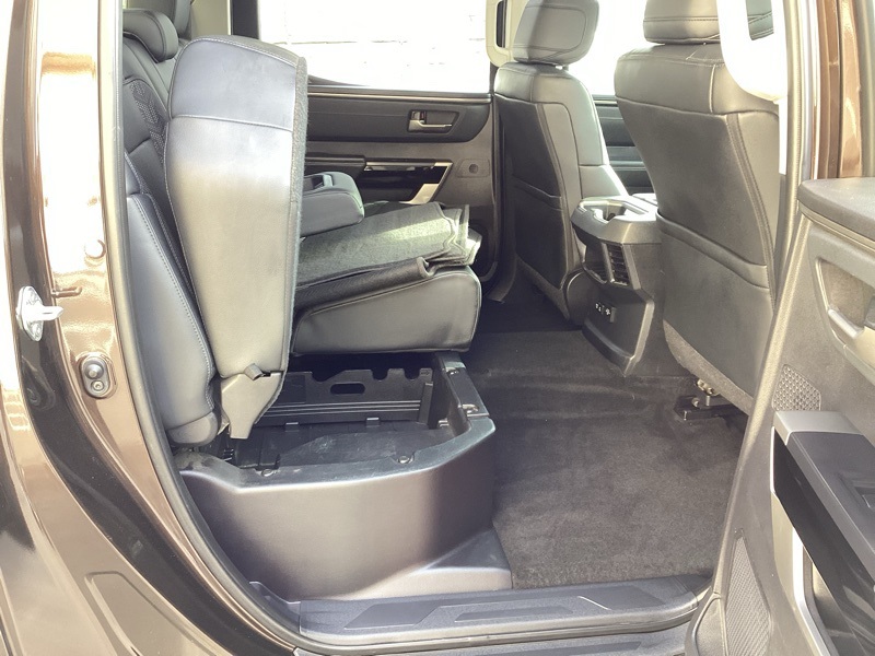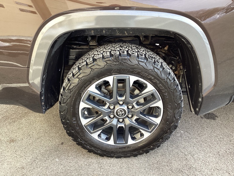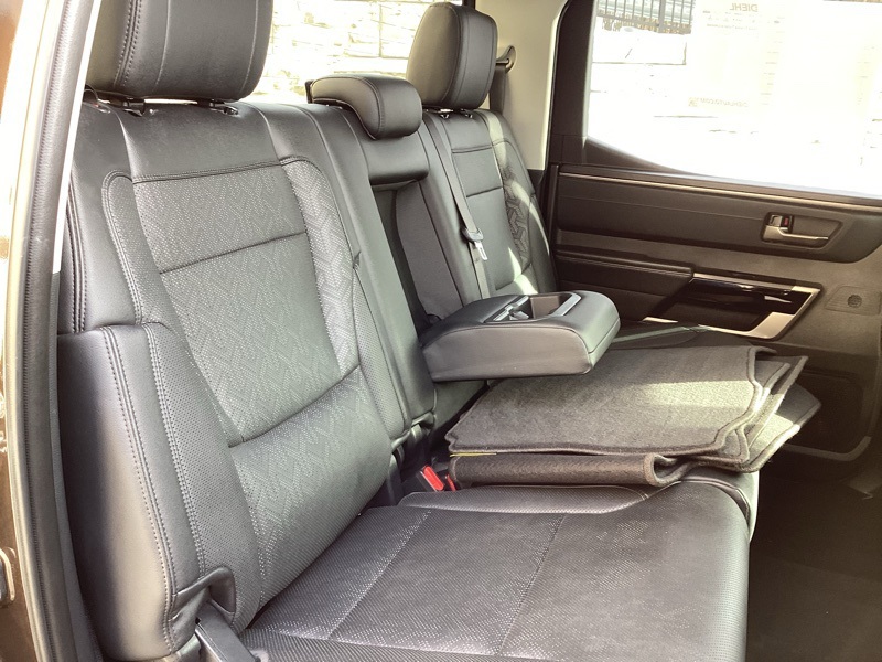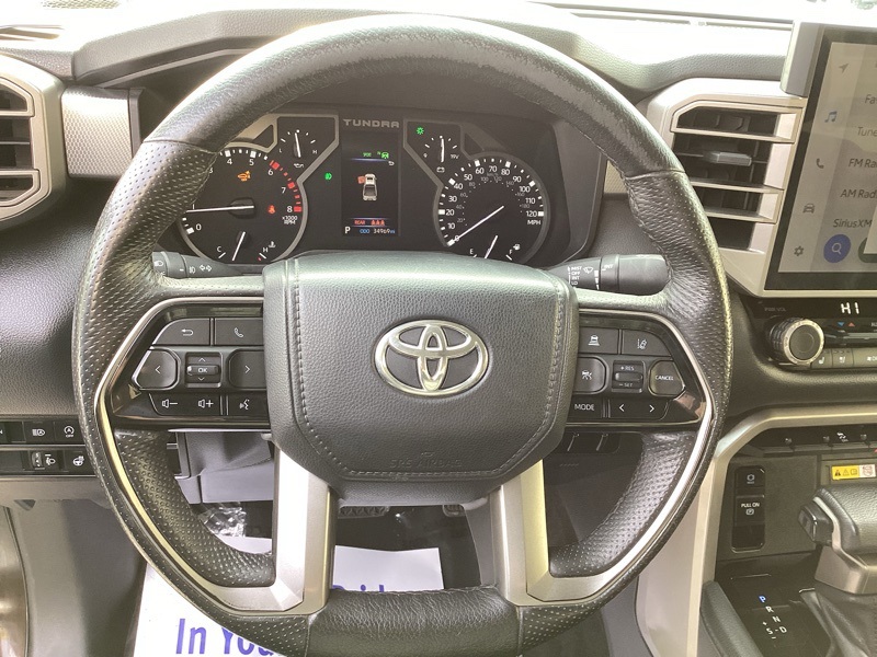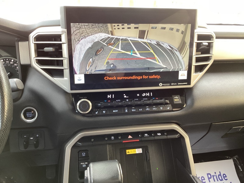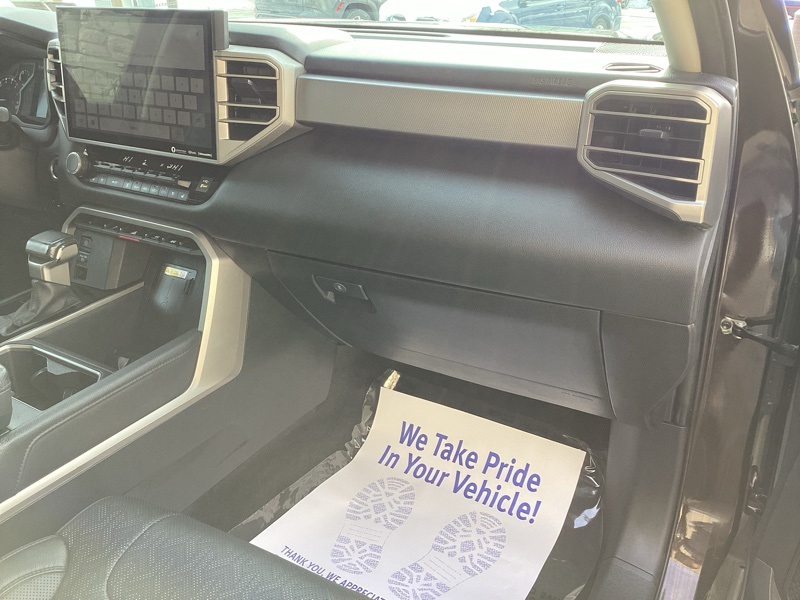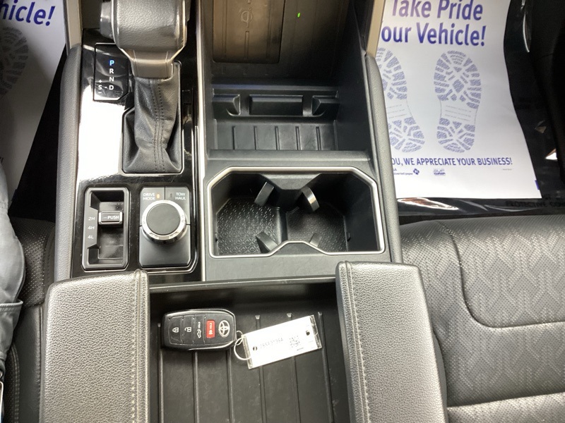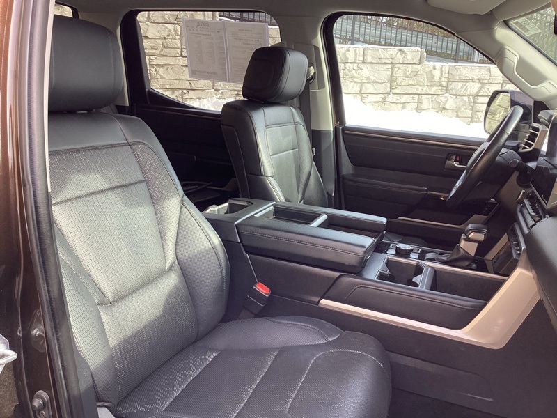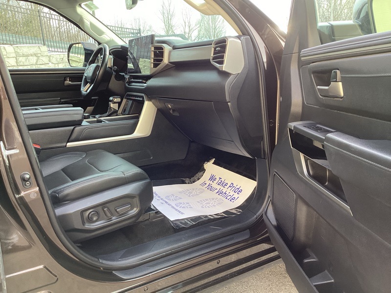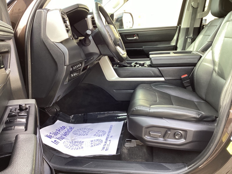 **ONE-OWNER**, 4WD, Black w/Leather Seat Trim, 20" Alloy Wheels, 3.31 Axle Ratio, 4-Wheel Disc Brakes, 8-Way Pwr Adjustable Heated/Ventilated Front Seats, 9 Speakers, ABS brakes, Air Conditioning, Alloy wheels, AM/FM radio: SiriusXM, Apple CarPlay/Android Auto, Auto High-beam Headlights, Auto-dimming door mirrors, Auto-dimming Rear-View mirror, Automatic temperature control, Brake assist, Bumpers: body-color, Delay-off headlights, Driver door bin, Driver vanity mirror, Dual front impact airbags, Dual front side impact airbags, Electronic Stability Control, Emergency communication system: Safety Connect (10-year trial), Exterior Parking Camera Rear, Front anti-roll bar, Front Bucket Seats, Front Center Armrest, Front dual zone A/C, Front fog lights, Front reading lights, Front wheel independent suspension, Fully automatic headlights, Garage door transmitter: HomeLink, Heated door mirrors, Heated front seats, Illuminated entry, Knee airbag, Leather Shift Knob, Low tire pressure warning, Memory seat, Navigation System, Occupant sensing airbag, Outside temperature display, Overhead airbag, Overhead console, Panic alarm, Passenger door bin, Passenger vanity mirror, Power door mirrors, Power driver seat, Power passenger seat, Power steering, Power windows, Radio data system, Radio: Audio Multimedia System, Rear reading lights, Rear seat center armrest, Rear step bumper, Rear window defroster, Remote keyless entry, Safety Connect, Security system, SofTex Seat Trim, Speed control, Speed-sensing steering, Split folding rear seat, Steering wheel mounted audio controls, Tachometer, Telescoping steering wheel, Tilt steering wheel, Traction control, Trip computer, Turn signal indicator mirrors, Variably intermittent wipers, Ventilated front seats, Voltmeter. Smoked Mesquite 2023 Toyota Tundra Limited 4WD 10-Speed Automatic 3.4L V6