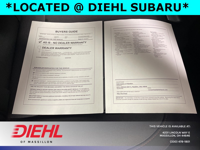 All Weather Package, Blind Spot Detection (BSD), BSD/RCTA & All Weather Pkg & Power Moonroof, Heated Exterior Power Mirrors, Heated Front Seats, Power Moonroof, Rear Cross-Traffic Alert (RCTA) System, Sun Visors w/Vanity Mirror & Lights, Windshield Wiper De-Icer. Recent Arrival! Certified. 2024 Subaru Impreza Sport CARFAX One-Owner. Clean CARFAX.