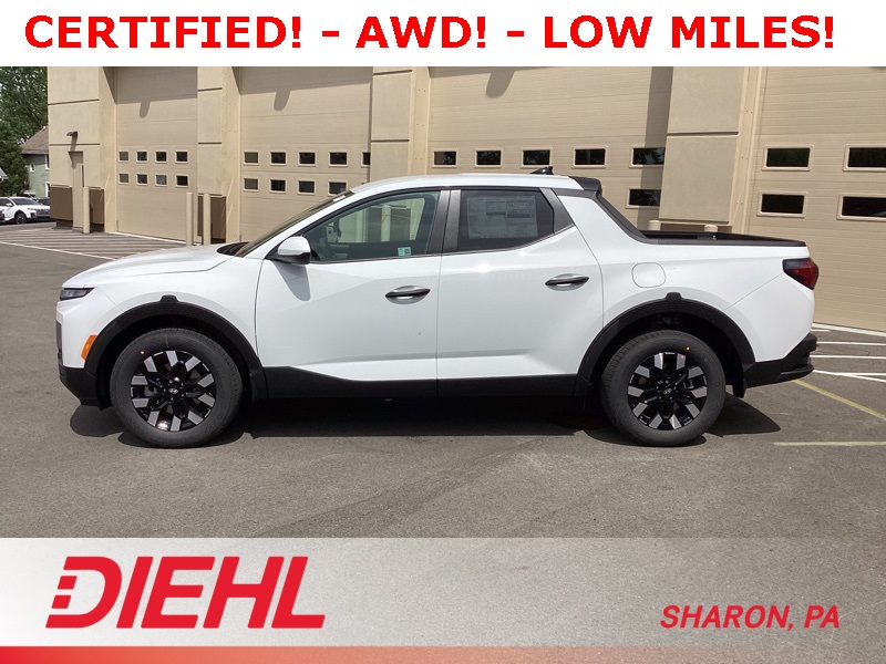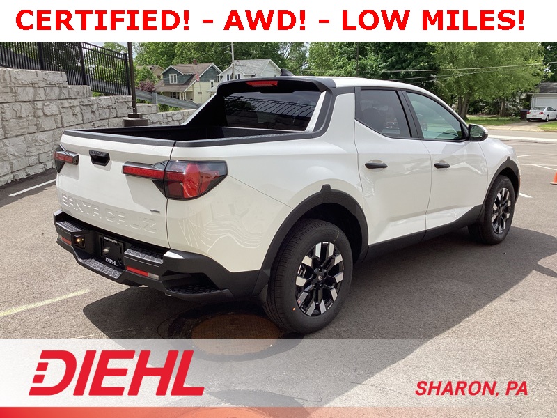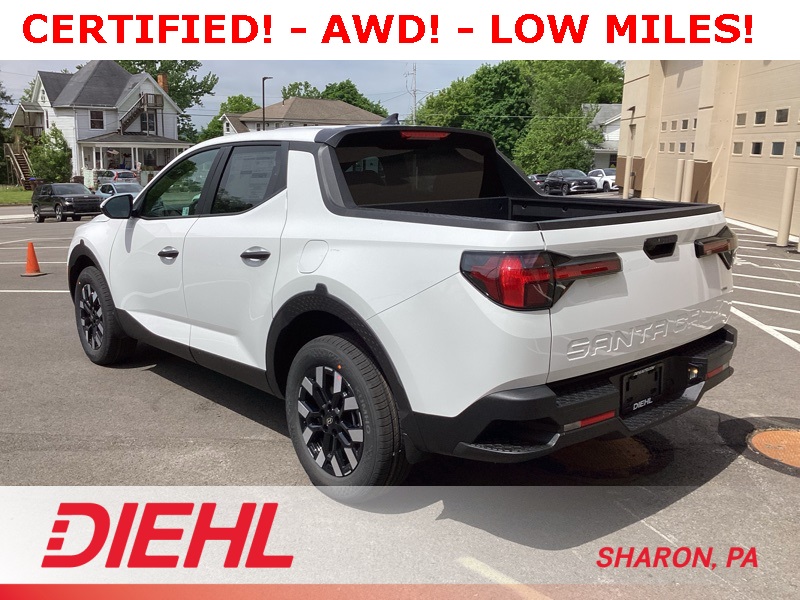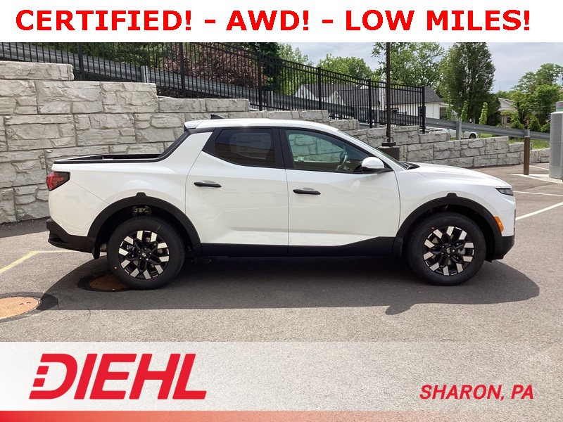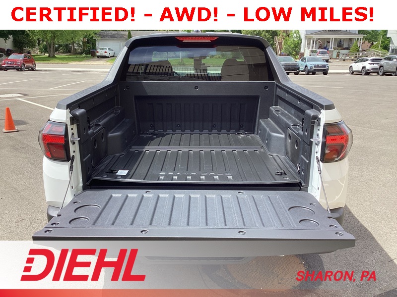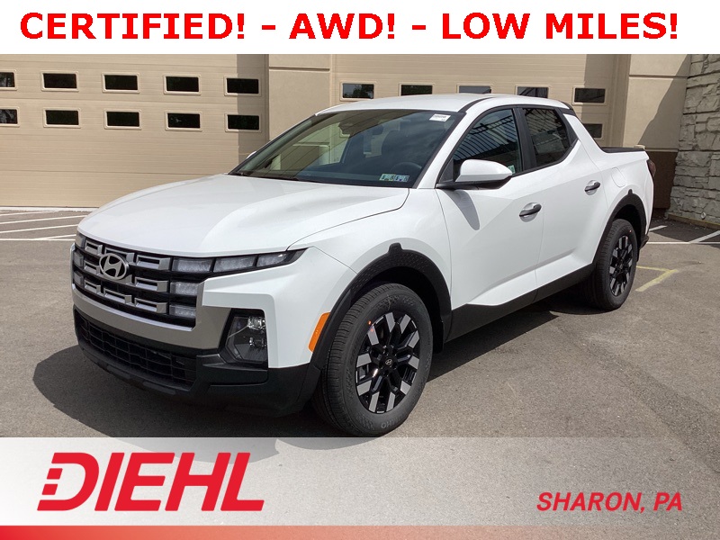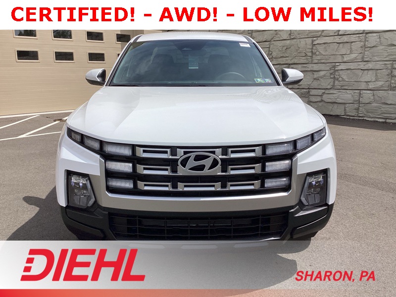 **ONE-OWNER**, **HEATED SEATS**, **BACKUP CAMERA**, **APPLE CAR PLAY**, **ANDROID AUTO**, **CERTIFIED PRE OWNED**, 18" x 7.5J Alloy Wheels, 4-Wheel Disc Brakes, 4.081 Axle Ratio, 6 Speakers, ABS brakes, Air Conditioning, Alloy wheels, AM/FM radio: SiriusXM, Apple CarPlay & Android Auto, Auto High-beam Headlights, Auto-leveling suspension, Bed Mat, Brake assist, Bumpers: body-color, Carpeted Floor Mats, Compass, Delay-off headlights, Driver door bin, Driver vanity mirror, Dual front impact airbags, Dual front side impact airbags, Electronic Stability Control, Emergency communication system: Bluelink+, Exterior Parking Camera Rear, First Aid Kit, Four wheel independent suspension, Front anti-roll bar, Front Bucket Seats, Front Center Armrest, Front reading lights, Fully automatic headlights, Illuminated entry, Low tire pressure warning, Mud Guards, Occupant sensing airbag, Option Group 01, Outside temperature display, Overhead airbag, Overhead console, Panic alarm, Passenger door bin, Passenger vanity mirror, Power door mirrors, Power steering, Power windows, Radio data system, Radio: AM/FM/HD Audio System, Rear anti-roll bar, Rear seat center armrest, Rear side impact airbag, Rear step bumper, Rear window defroster, Remote keyless entry, Security system, Speed control, Speed-sensing steering, Split folding rear seat, Spoiler, Stain & Odor Resistant Cloth Seat Trim, Steering wheel mounted audio controls, Tachometer, Telescoping steering wheel, Tilt steering wheel, Traction control, Trip computer, Variably intermittent wipers, Wheel Locks. Certified. Atlas White 2025 Hyundai Santa Cruz SE AWD 8-Speed Automatic with SHIFTRONIC 2.5L I4
